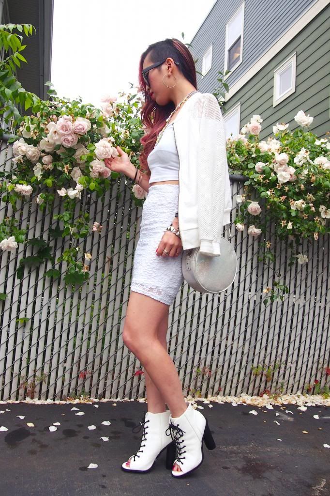 When I got these awesome open-toe lace-up booties, this looks instantly popped into my head. Since my hair is pink now, I thought it would be fun to mix up a theme of sweetness and sportif all together. I am totally in love with this combo! While an off-shoulder cropped top and a lace mini skirt emphasize the femininity, it doesn't look too girly and is actually more bouncing and lively because of the bomber jacket and lace-up booties.