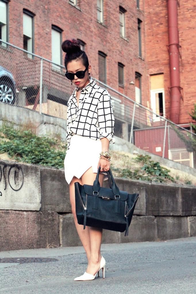 It's finally the weekend! I hope you have made fun plans!I beleive that you have seen a lot of previous looks that feature "ALL-WHITE" over the last few months, and yes the strenth of that awesome ensemble has never diminished for me. It actually gets greater and greater. And here you go, another one again. I think all-white looks are definitely the new black, but this time I added a little twists into it: Wearing the grid print shirt.