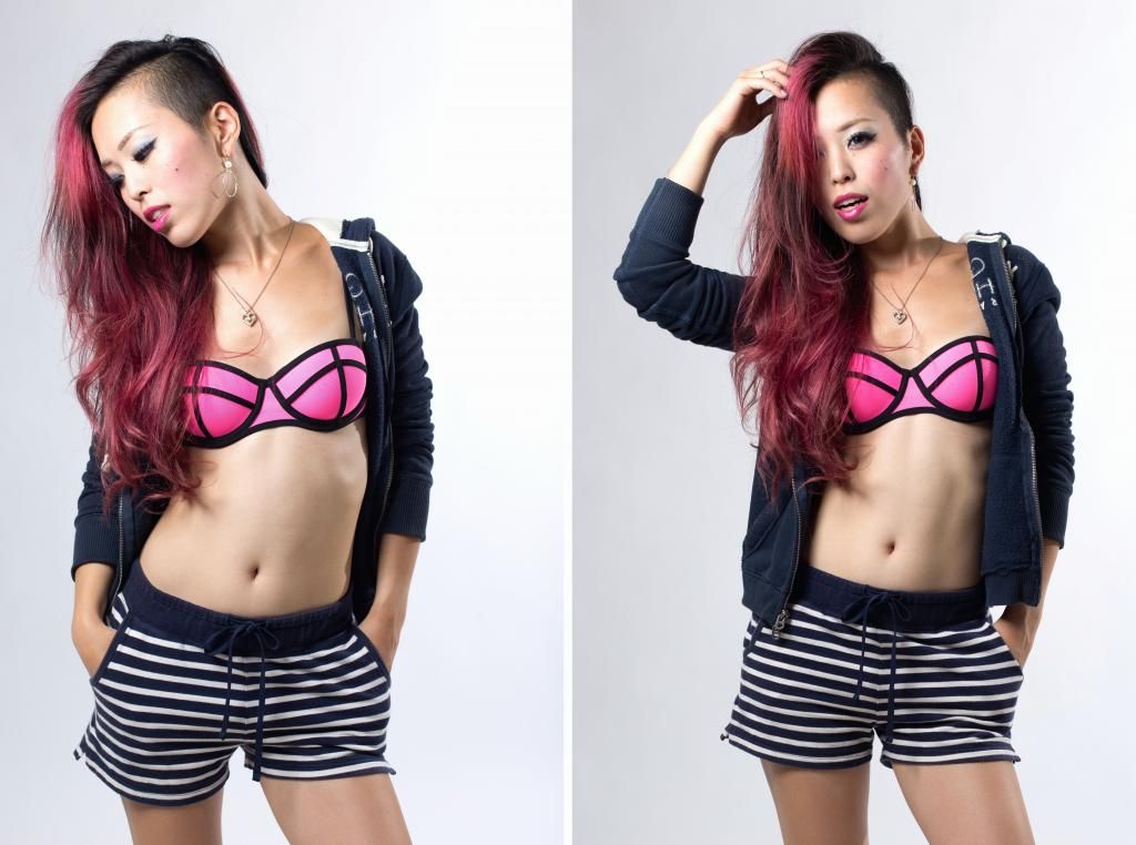 That said, don't you think Eric did an AMAZING job making both me and the underwear look both charming yet seductive?? I played around with it, styling it up in different ways: wearing fake glasses or some little gold jewelry and changing the lip colors...  Underwear is cute by itself, but I like it also paired with a hoodie and/or with room wear clothing such as lounge shorts. The bra turned out looking like a cool sporty bra and the neon color stands out vividly!