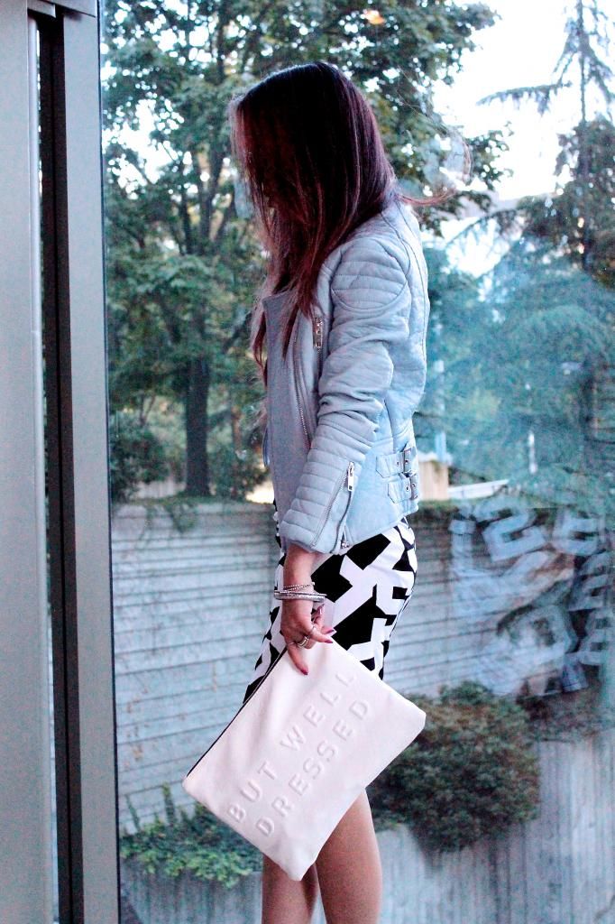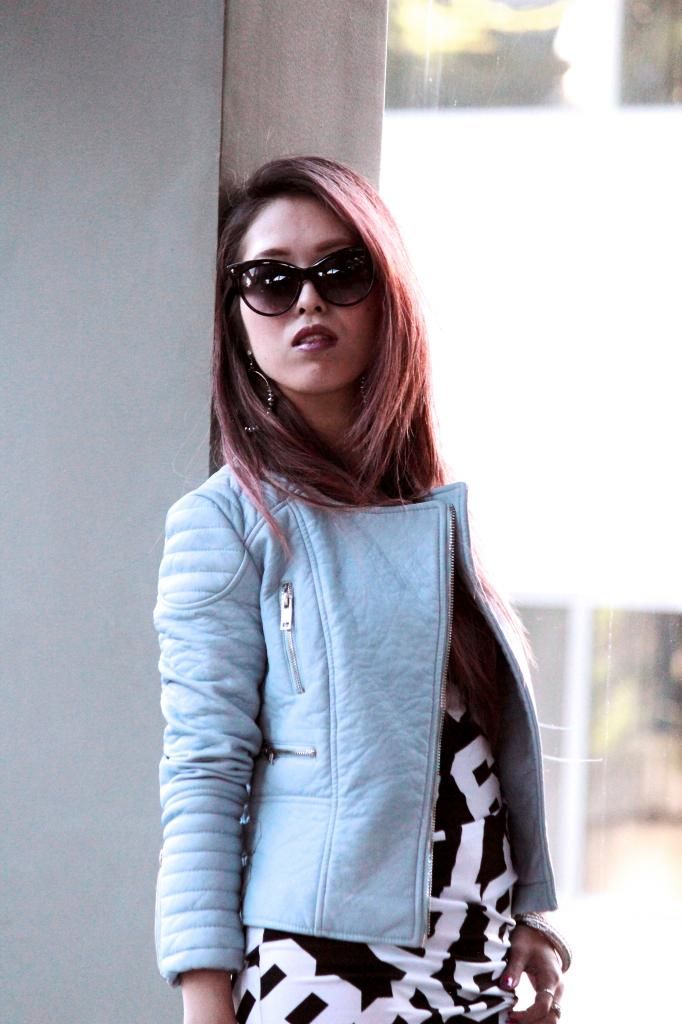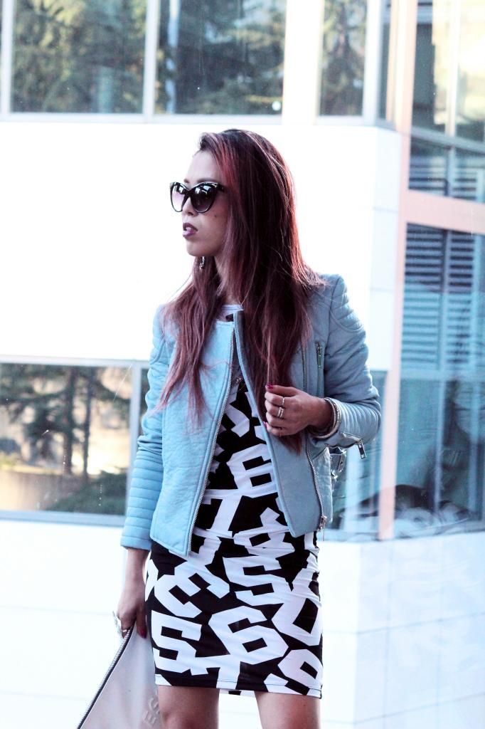 Yay! Weekend is finally here!Today's post is going to be short and sweet. When I was looking through the pictures from fabulous Fashion Week for the last few months, Eva Chen's black and white number print dress really caught my eyes and right on time I found a similar dress on Ami Clubwear. (Unfortunately it's sold out :( ) The print is just awesomely unique, yet head-turner, isn't it?! I always can't take my eyes off anything with amazing prints and details! My style is all about uniqueness, and this dress definitely embodies that feature. Even though this is a bodycon dress, which is considered to be worn for nigh out, I wanted to create a day look with it. So I simply paired it with this awesome pastel biker jacket and a white clutch bag with inspiring quotes on the both side. Since the print makes the dress edgy and cool, I went with stunning faux leather booties, also courtesy of Ami Clubwear, to complete the look. I extremely adore the details all over the shoes, especially the heel part!