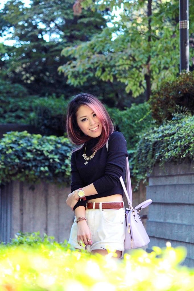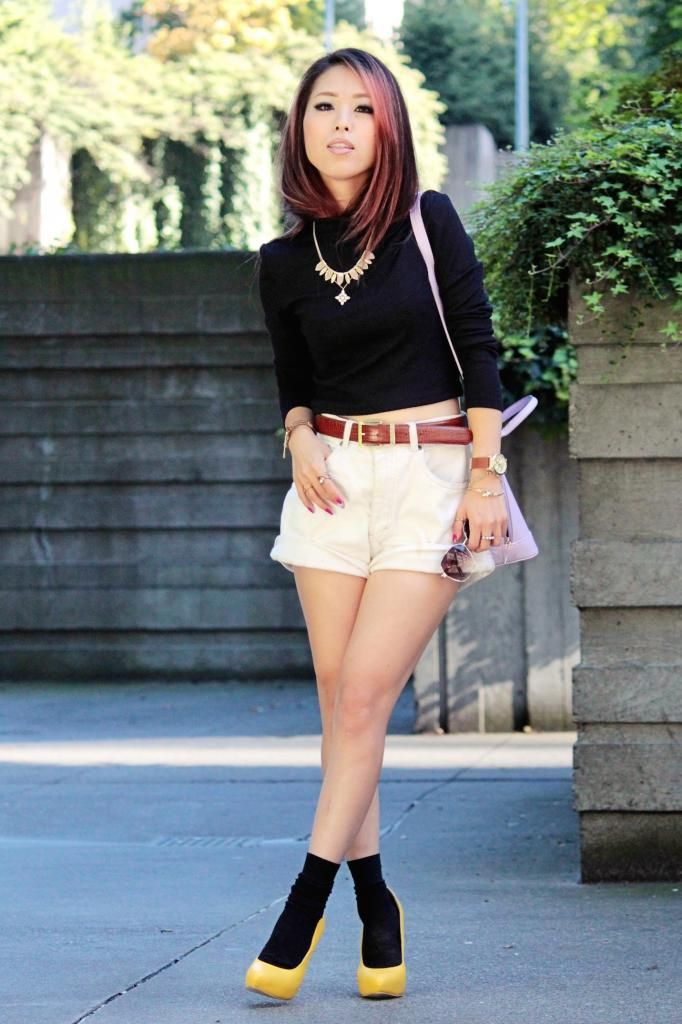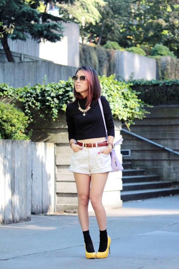 I paired it with my vintage high-waisted shorts and two new items from Ami Clubwear: yellow pointy toe pumps and a lavender tote mini bag. I love how they give the outfit a 60's vibe, so to emphasize it further I added a pair of ankle socks. The temperature is dropping now, and wearing pumps with bear feet give me a chill. Yet, wearing tights would be too hot and dull during the day. That's why adding a pair of socks is season appropriate and gives you a touch of chicness. Even it helps to upgrade your fall look. You may have noticed a little change in my hair, huh? Yes, I spontaneously chopped off my hair!!! Haha. Just kidding, instead I found a super easy way to style a bob hair style without cutting off your beautiful hair! Just wear a turtleneck (It's super trendy and snuggling!), and don't pull your hair out from the collar! It doesn't sound like it would work out, so I was pleasantly surprised when I tried it! I really like easy hairstyles that produce a wow factor.