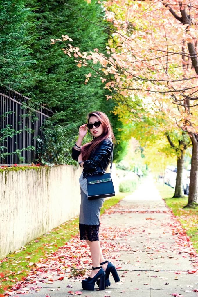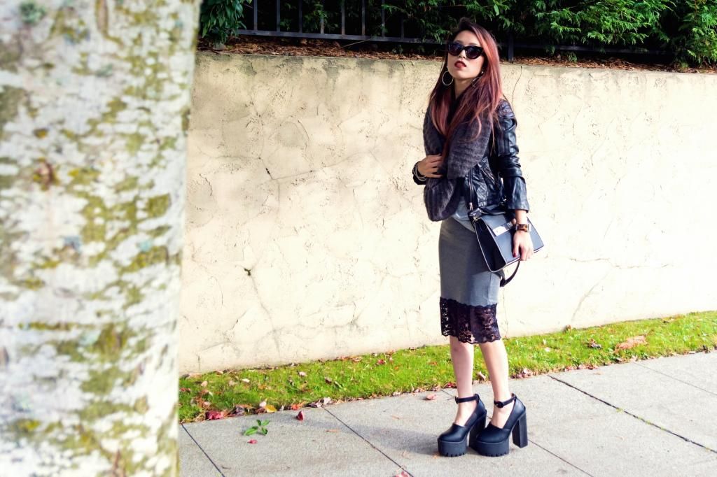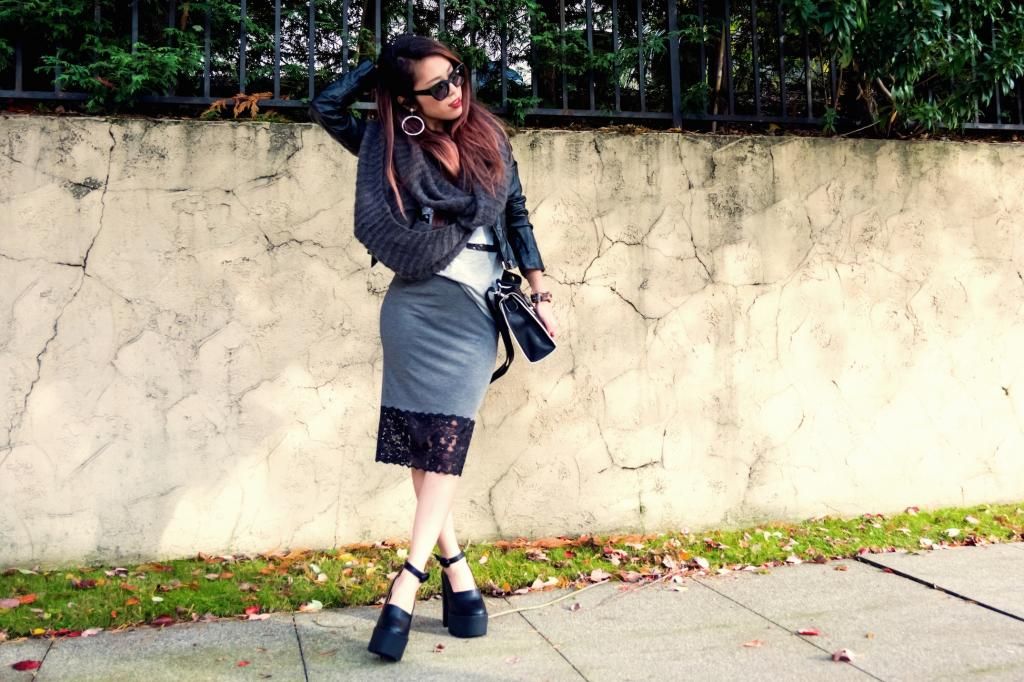 When it comes to fall ensembles, I am awfully fond of mixing things up with different shades of gray. I worn gray hued look back in January, and since then I really got into gray-on-gray looks. Since summer has ended, I am currently keen to take stock of my lovely GRAY pieces so I can create some all-gray outfits for this fall and winter! I am already so excited imaging how I am going to end up combining all of the gray items I have!For today's outfit, I would like to introduce this cute pencil skirt with a lace hem design. I recently purchased it at ASOS and it definitely goes into my "gray" collection. The lace hem detail on this skirt takes any look to the next level and adds that oh-so-important feminine touch to any look. I put it together with a gray jersey (This is super comfy and super fun with its sequined print!) to create a gray-on-gray look, then I added an edgy vibe by pairing them with black items to complete the look.