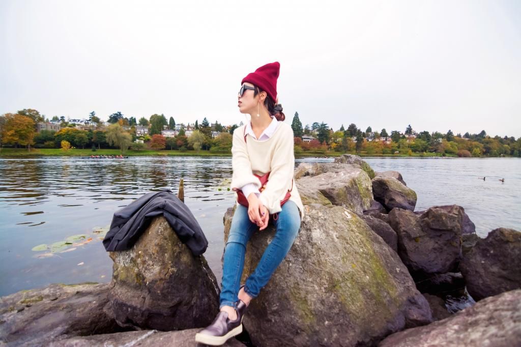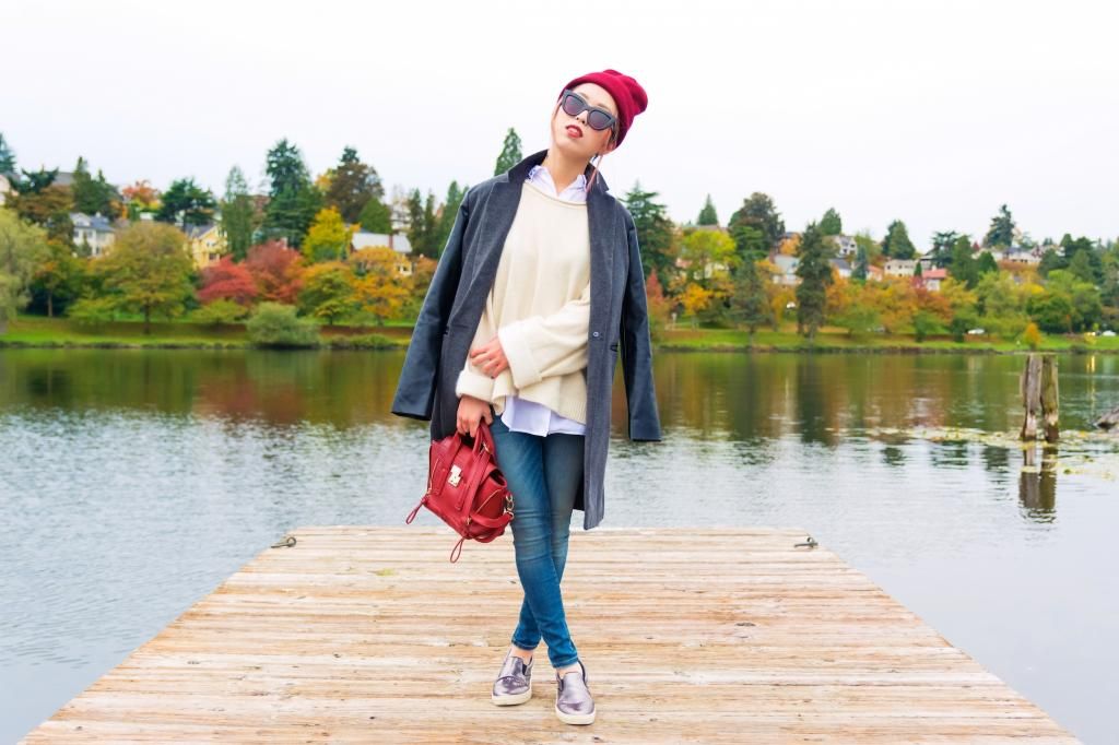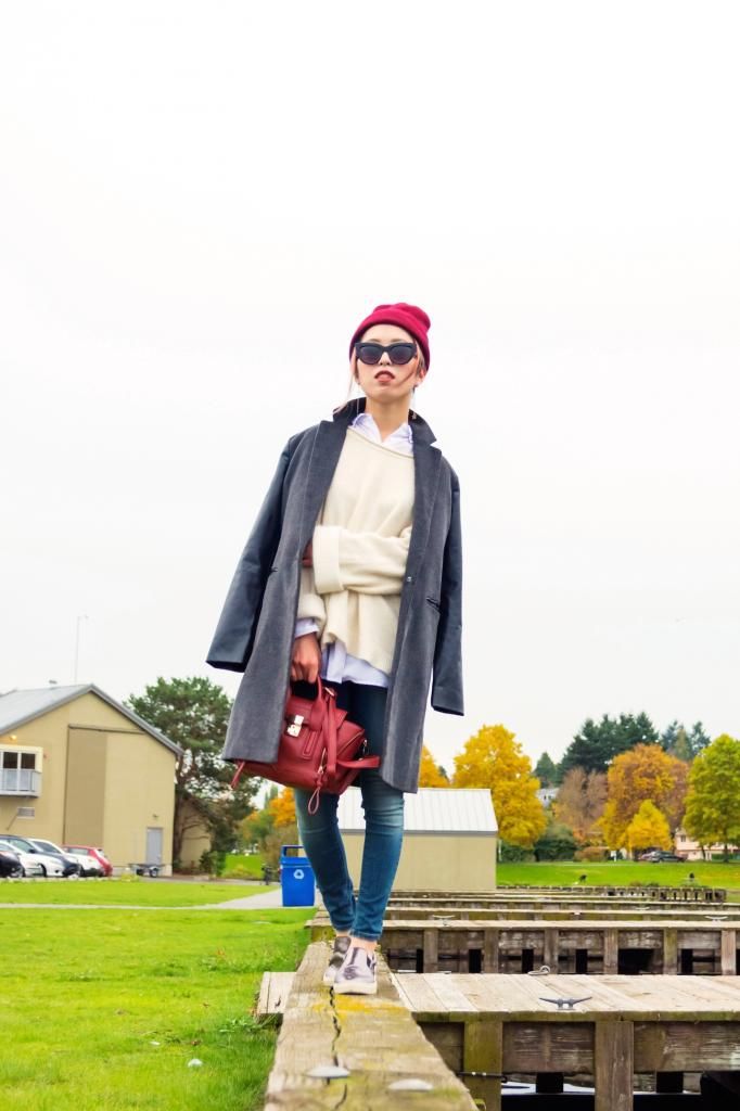 Whenever I wear flat shoes, I always make sure to create an "I" figure or to try to raise the eye sight up by wearing a hat or styling the hair with updo. So I combined with a pair of skinny jeans and a long coat and finished off the look by pairing a beanie. The beanie is red which is great and so bright that I can catch the first sight to the top, not to the bottom part when being seen. It's also all about feeling cozy and snug this season! I love layering up with a shirt and sweater and tossing my coat over the shoulder! It's super effortless yet on-trend!
