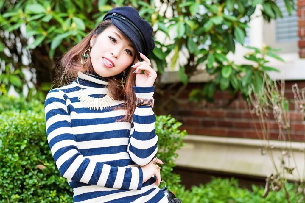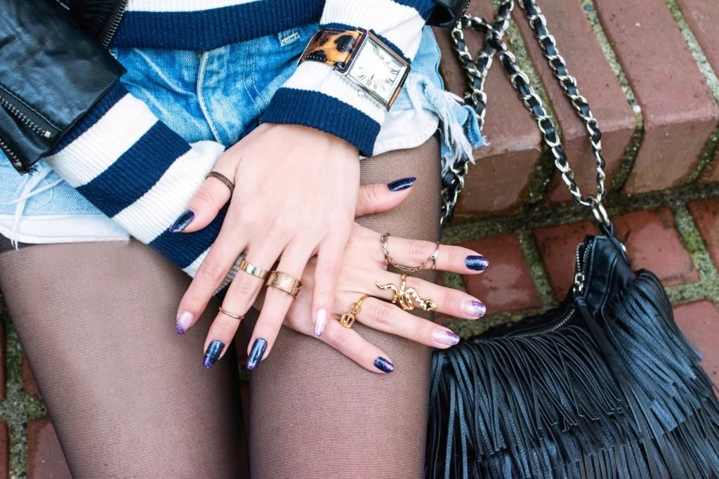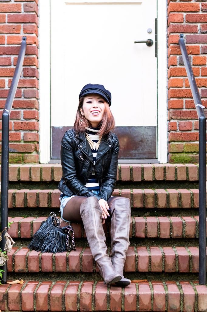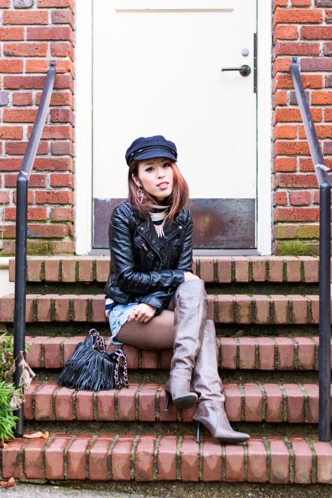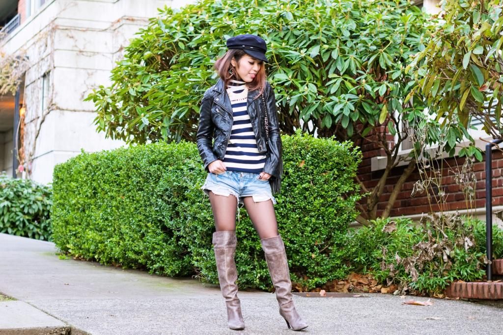 I wore this outfit a few weekends ago, and you have no idea how much I love this fun look! Navy is definitely one of my favorite colors to wear during this season! Lighter than black and a smattering of color that makes a look cheer. I've been in love with this navy military cap and stripe turtle neck ever since I've owned, so I styled them together. I really adore how the outfit turned out effortlessly chic. Paring a turtleneck with denim shorts and over-the-knee boots are such an easy yet cozy combination! Oh don't forget to put on tights for extra warmth! Wearing a biker jacket adds a great amount of an edgy touch. I could wear this ensemble for any kind of occasion; a brunch date, a quick coffee meet with a friend, movie night, or even just running errands! It could be a perfect date style as well, if you switch the denim shorts into a skirt! Absolutely my everyday go-to look! And when your nails match with whatever you wear, that's even more fabulous!