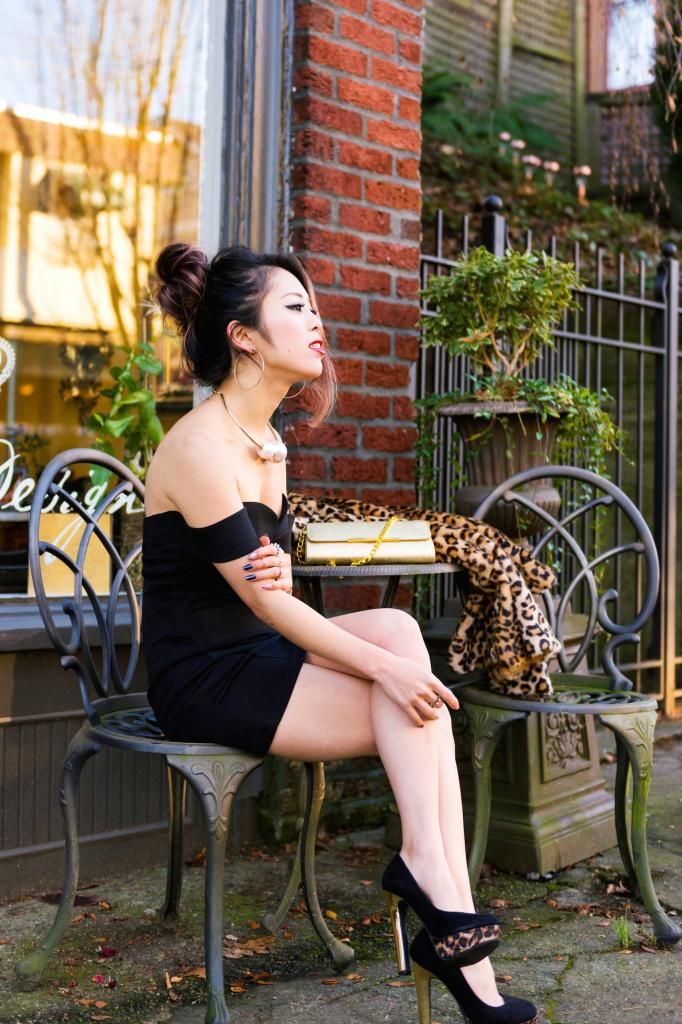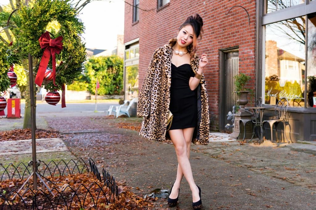 I decided to pair this dress with my favorite black platform pumps that have gold and leopard print details. Whenever I wear a dress, I tend to wear platform heels to balance out my height, since I have a long torso with short legs. The reason I chose this pair of pumps is that I could match them with my gold accessories and leopard coat that I recently scored at Forever 21. Even though you will take your coat off at a party, you want to keep that wow factor even when you are headed to the party, don't you? Well I do! So it's great to throw on a statement coat over your lovely party dress. That way you can definitely provide double WOWs!! This leopard coat is super duper cozy and its plush texture is beyond amazing!
