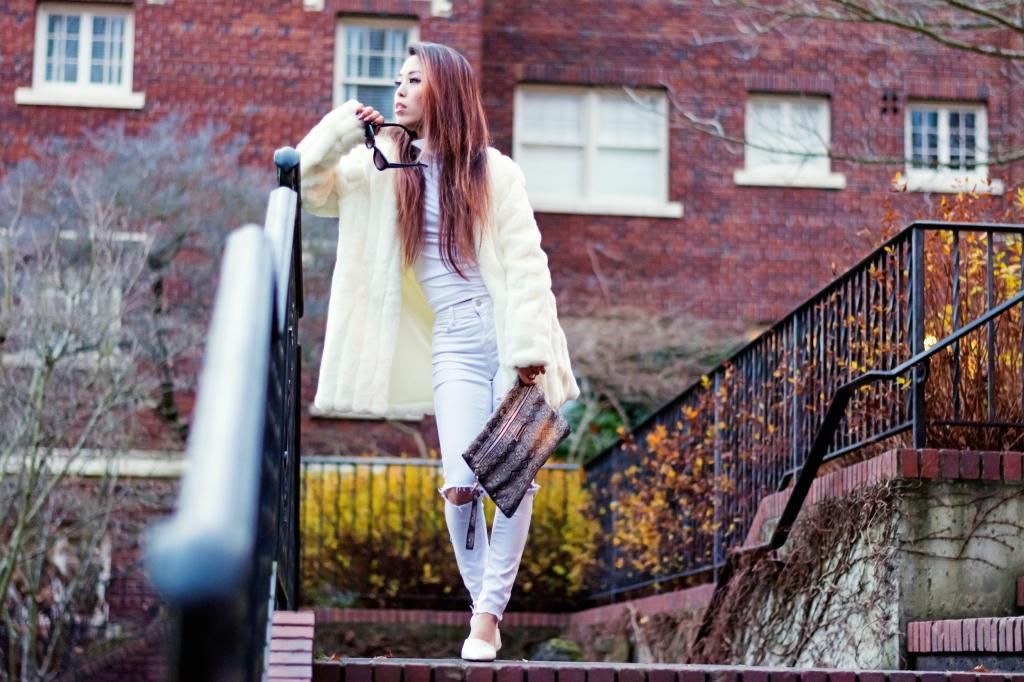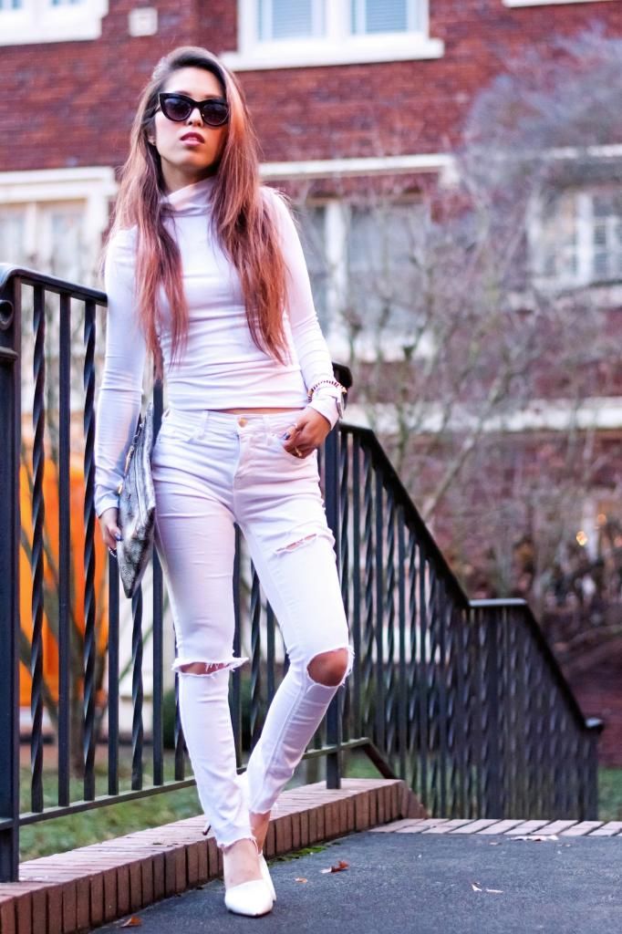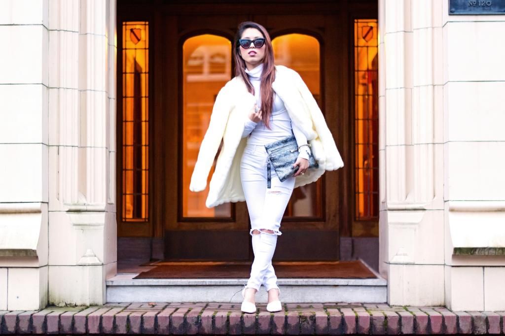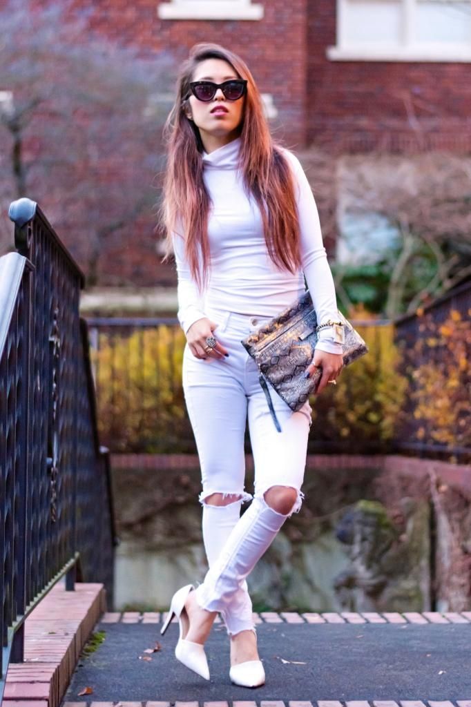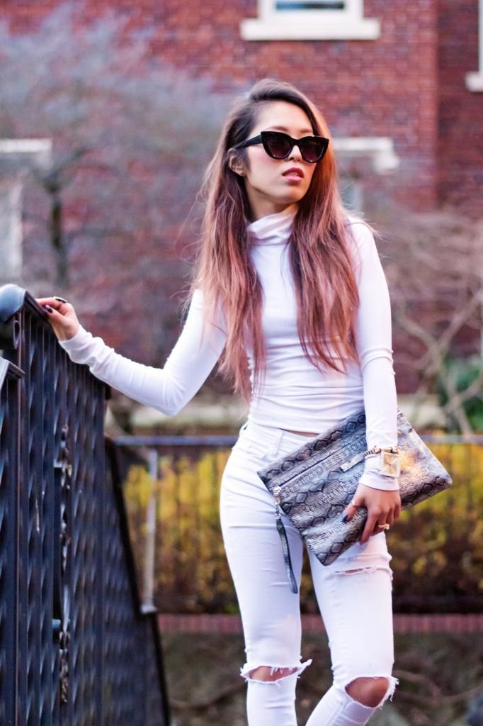I've tried several times all white styles for the last few years over the summer, but never done in winter. So why not challenge myself to give it a try? It's a new year, and it's all about trying new things without fear, right? Right on time, I got this slick white turtleneck from ShopRoxx, and I simply paired it with my white wardrobe. Super effortless coordinating ever! Normally I add accessories or mix with vivid color items as I go for head-to-toe all white look, but this time I kept the whole look as simple as possible. Yet I couldn't help myself tying it with a snakeskin clutch for a bit of eye candy.