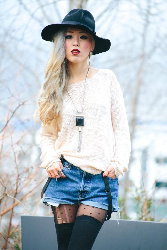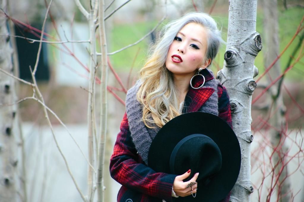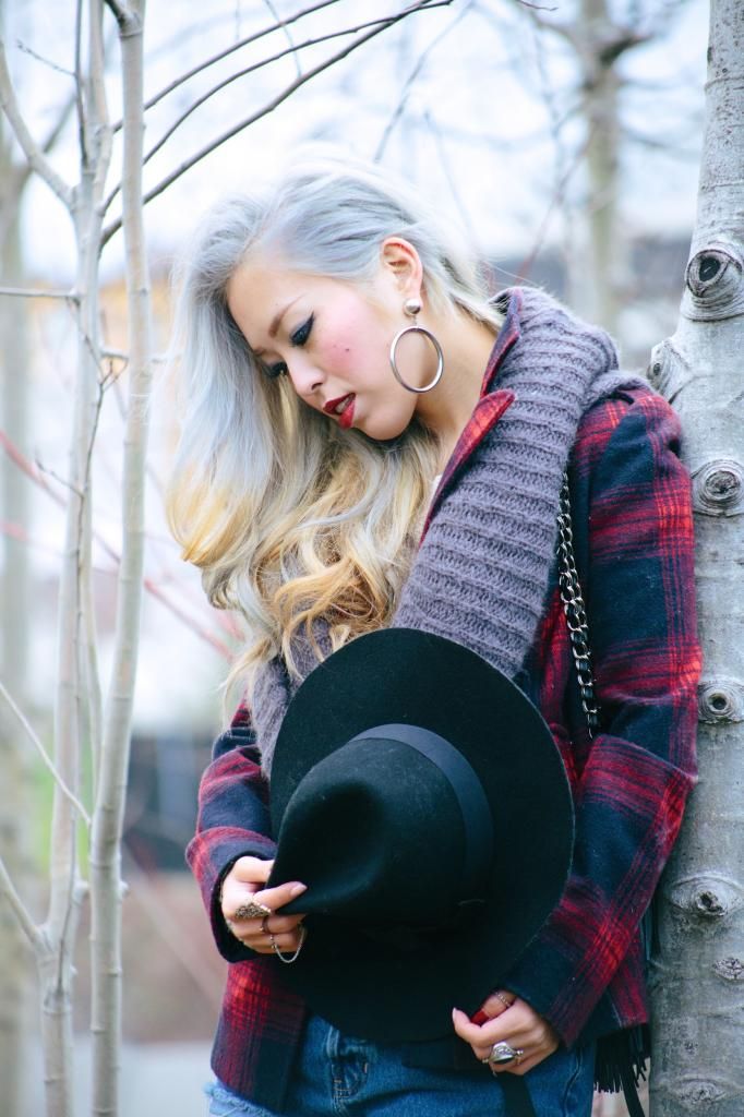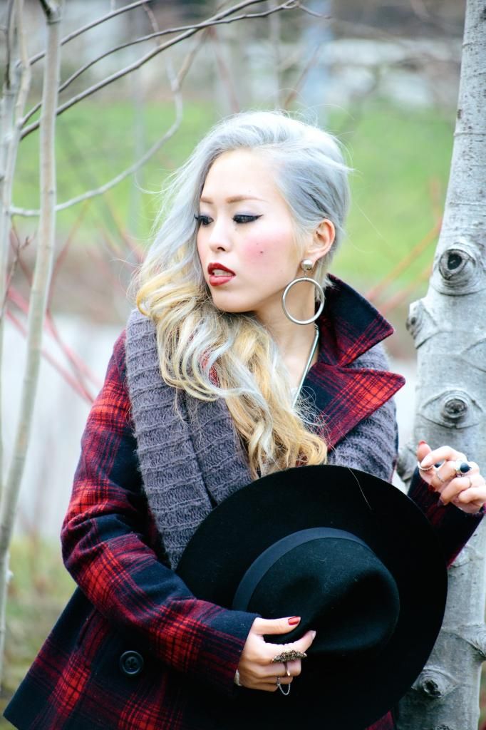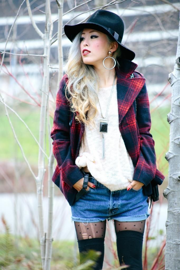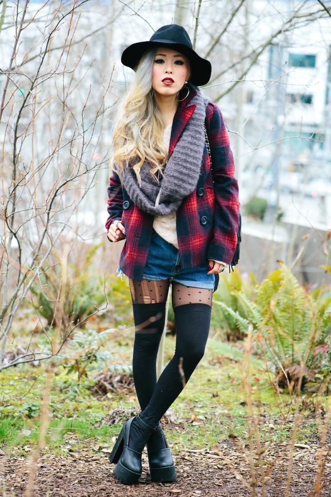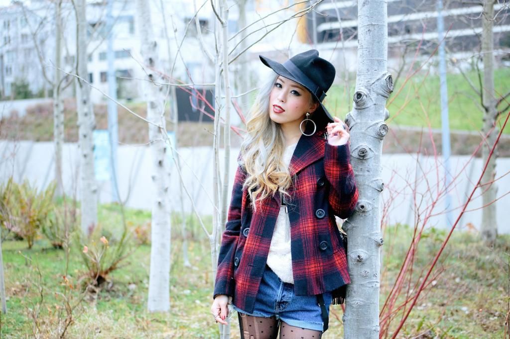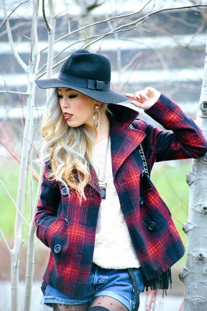 Plaid items are always perfect to create a grunge/rock style and can't get enough of how they can instantly add a pop of color to the look! Luckily I had this super lovely plaid peacoat! It's old but I can't get rid of this old cute number! So I created this look around it. I am a kind of girl who wears shorts during winter. Yes, some people probably call me crazy. Yet if you layer with tights and over the knee socks, you rock on! To emphasize the vibe, I purposely put on a suspender hanging down and paired with chunky platform shoes with lots of silver jewelry! I picked wide brimmed hat recently got from Romwe and dark toned red lip glaze from AVEDA as my finishing touch!