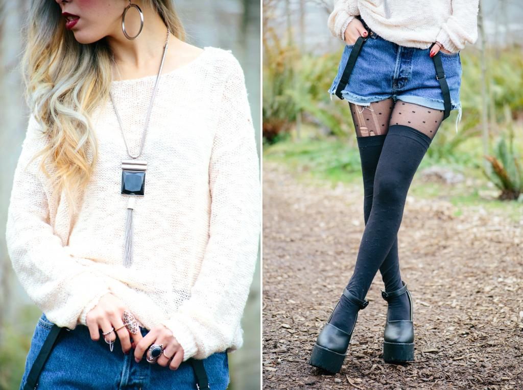 ACCESSORIES :: ASOS tights, Urban Outfitters socks, Forever 21 rings & earrings, Romwe hat, Suspenders from Japan (similar here), AVEDA lip glaze