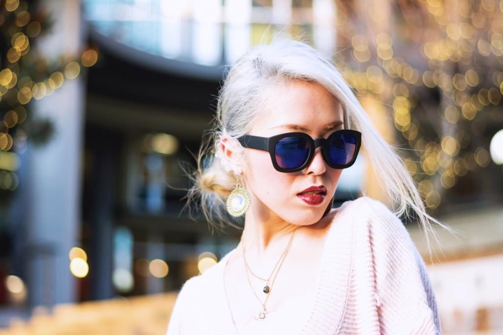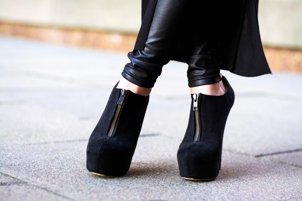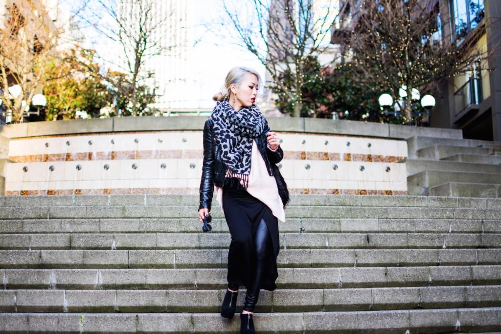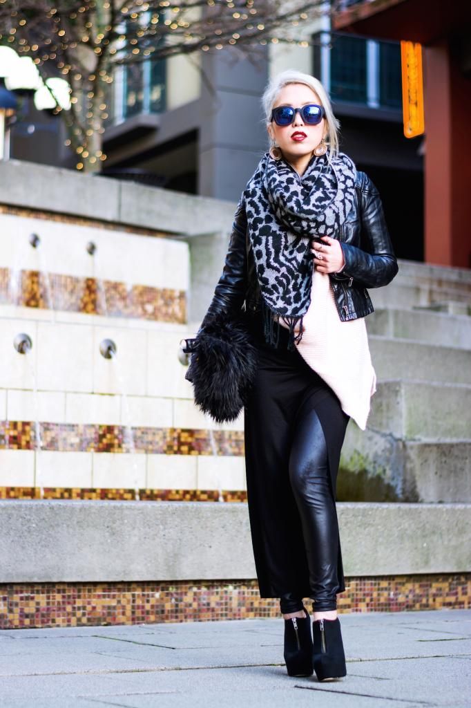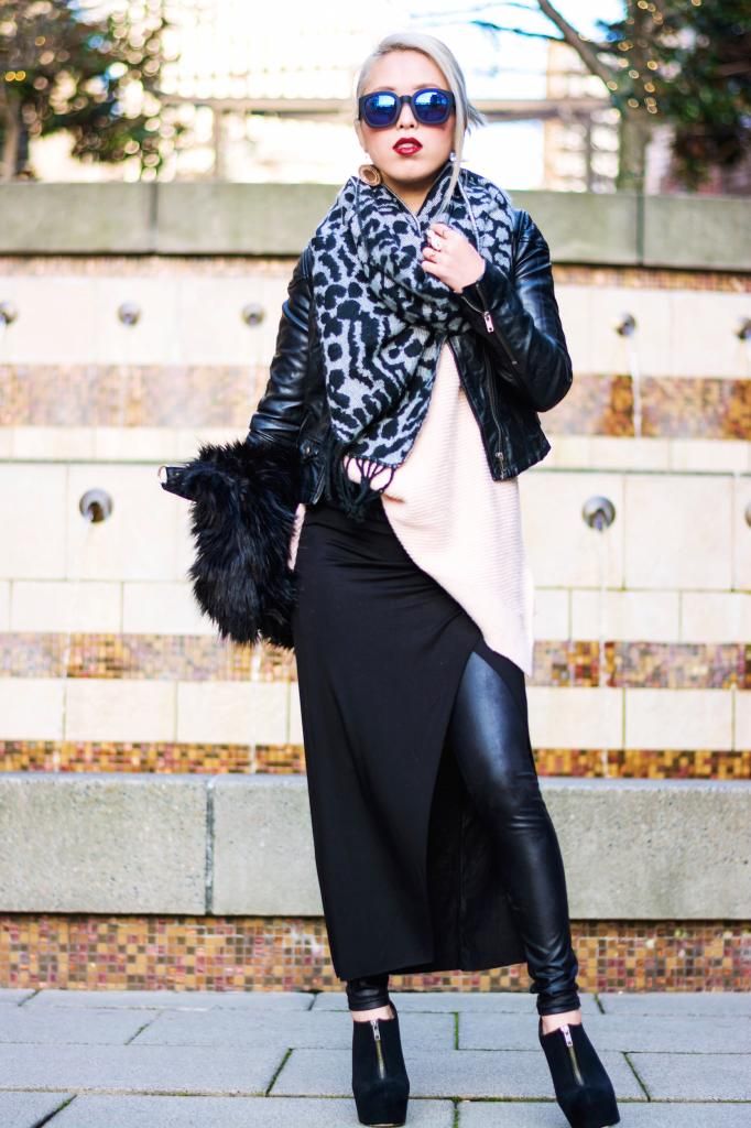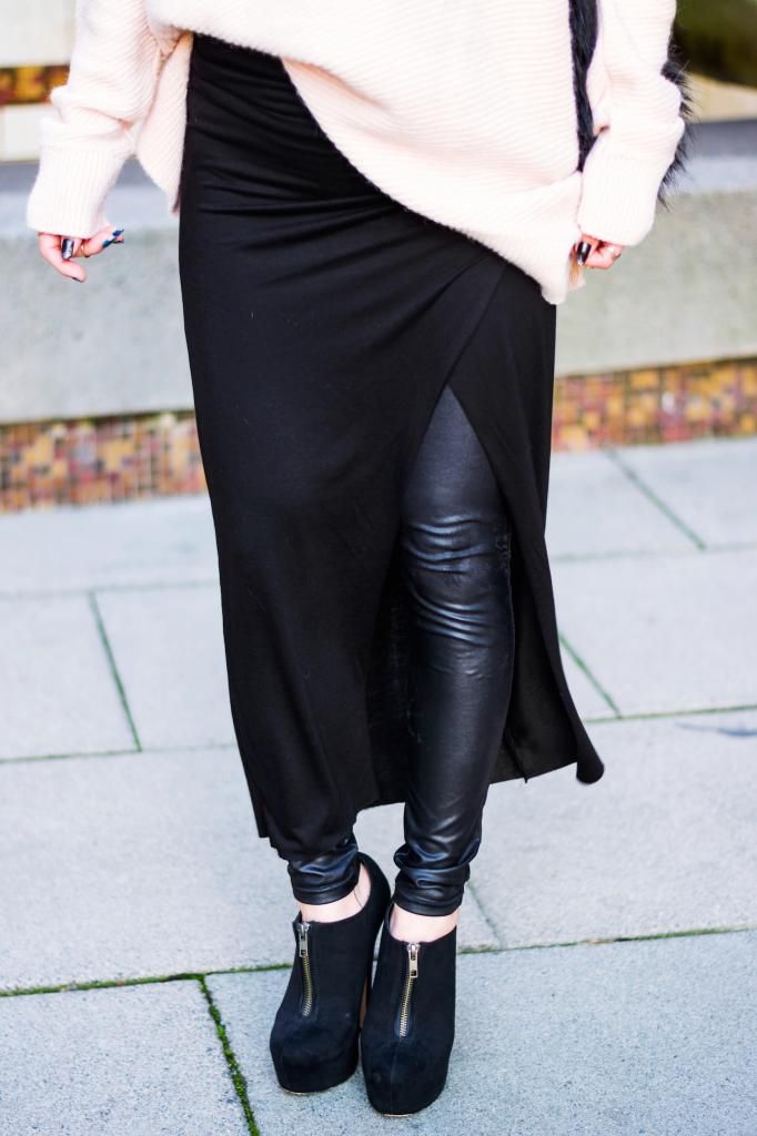 Today's look is all about layering and edginess, and this is definitely one of my favorite ensembles in all-black with a touch of color. People tend to wear dark colors during winter, and so do I. However, I love playing with some hues and making the look both edgy and fun. That way, I don't feel dull and sad. This is especially when you live in a gloomy and rainy city like I do! I'd been on the look-out for a chunky v-neck pastel sweater for the longest time, and I finally found it on sale at ZARA a while ago. I normally wear a small size, but decided to go with one size up for an extra bulky silhouette. At the same time, I scored this light maxi wrap skirt on sale as well. It's impressive that I can rotate the slit to whatever position I want to! I can put it on the side, front, or back. I adore the combination of an oversized knit with a maxi skirt. Since I had scored the perfect pieces, I figured I should try it on right away, yet it's way too cold right now to wear the skirt by itself, so I paired it with leggings underneath. I love the contrast of their different textures. Whenever I wear a maxi skirt/dress, I always style it with a pair of platform shoes to add some extra height. I picked my all time favorite booties for the added slimming effect.