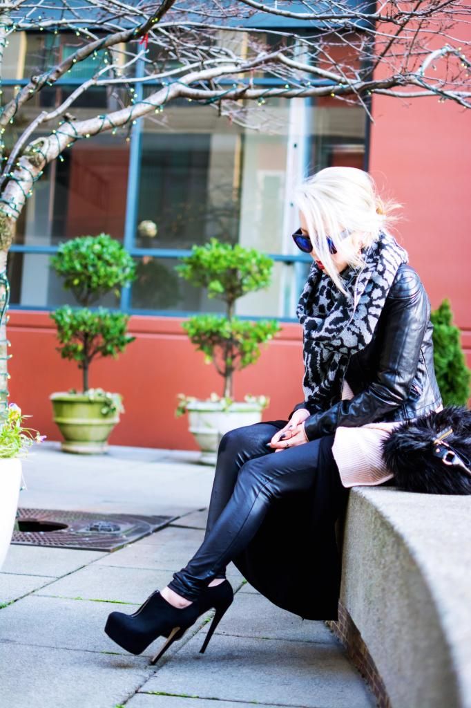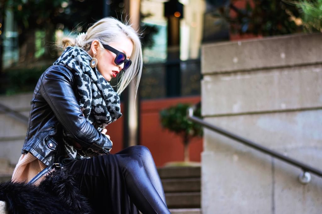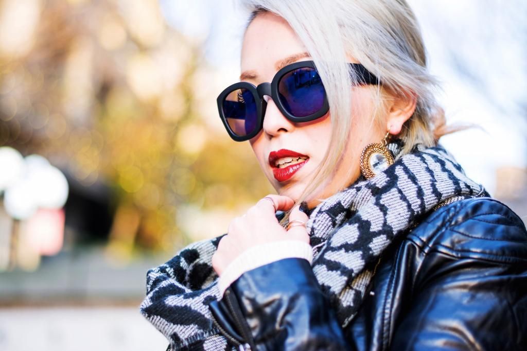 You can never go wrong with a biker jacket to create an edgy vibe. And if you have a printed black and white scarf, that's even better to emphasize the vibe. These items aldo help you beat the cold. To complete this edgy look, I opted for a dark red lip stick, and of course my awesome hair is doing such an awesome job!