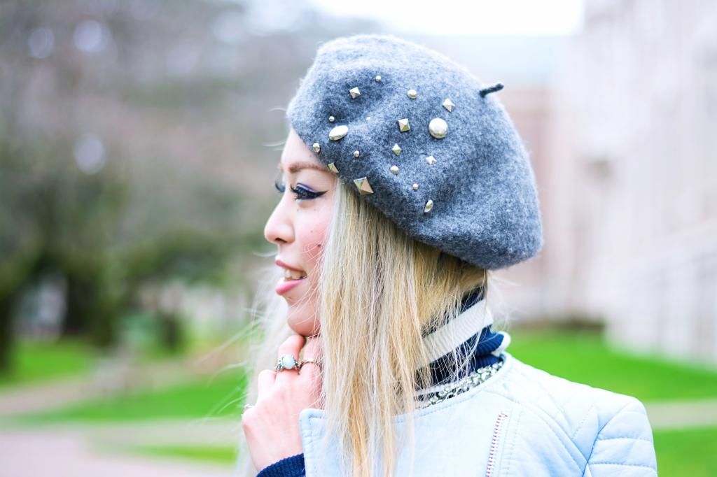 I wanted to go for a completely winter preppy chic, so I styled it with a navy striped turtle neck and over-the-knee boots. These items are always perfect to achieve a preppy look during this season! Then, I put on a gray beret hat with hair tucked in the sweater to play up the vibe. Even though it was pretty warm on the day I wore this look, I needed an outerwear for a chill night. I chose my pastel biker jacket to brighten up the mostly all-black look and also match with my new icy blue mini bag! I just can't get over when my jacket and a bag are complementing their color with each other.