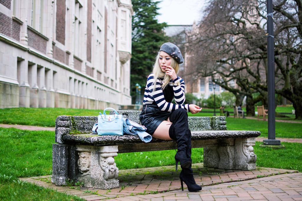 I wanted to go for a completely winter preppy chic, so I styled it with a navy striped turtle neck and over-the-knee boots. These items are always perfect to achieve a preppy look during this season! Then, I put on a gray beret hat with hair tucked in the sweater to play up the vibe. Even though it was pretty warm on the day I wore this look, I needed an outerwear for a chill night. I chose my pastel biker jacket to brighten up the mostly all-black look and also match with my new icy blue mini bag! I just can't get over when my jacket and a bag are complementing their color with each other.