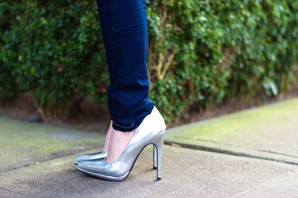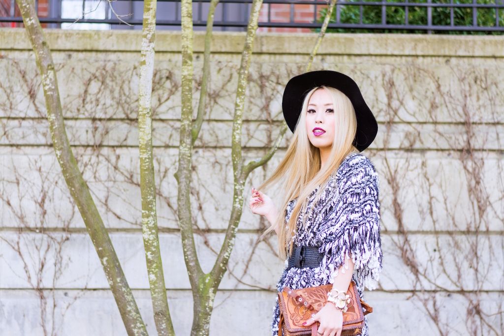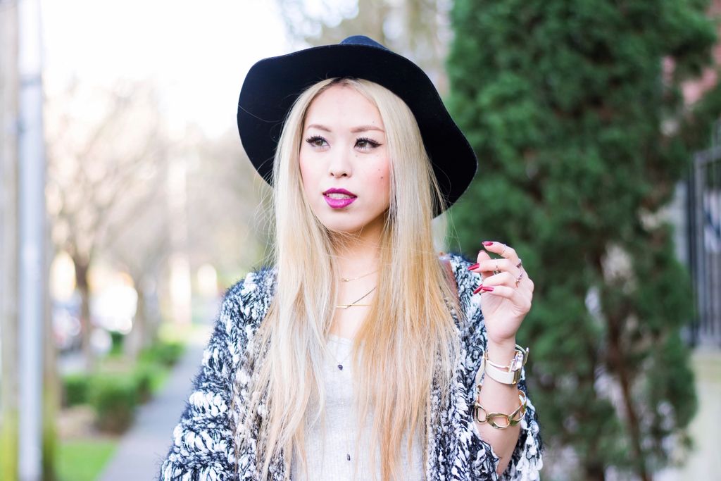 I finally got my hands on a pair of high waisted skinny jeans that can perfectly go with everything! I have been adoring a combination of hight waist jeans and cropped tops. But really didn't have a chance to meet the perfect pair. In this spring and summer, denim items will be one of the hot trends, and I am sure you will see me in these skinny jeans countless times! Since the shaggy knit cardigan has a texture and prints, I went with a simple cropped top to make the cardigan pop and put on a wide brimmed hat for a boho vibe. Adding something brighter is definitely an great way for transitioning into a spring look, and I chose my new silver pumps and red violet lipstick to finish my outfit.