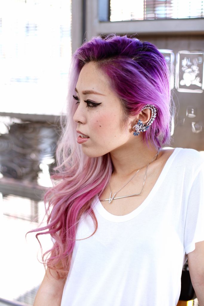 Oooh, I love your layered necklaces! And wow, the ear cuff is something! Best of all? I love the neutral color scheme of your outfit set against your purple hair, beautiful! :)
