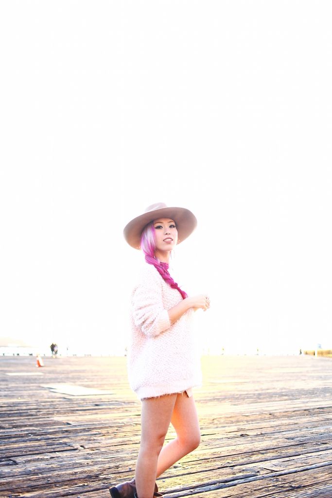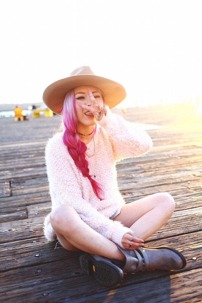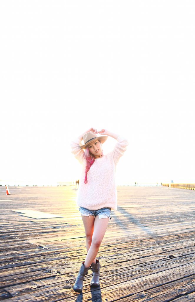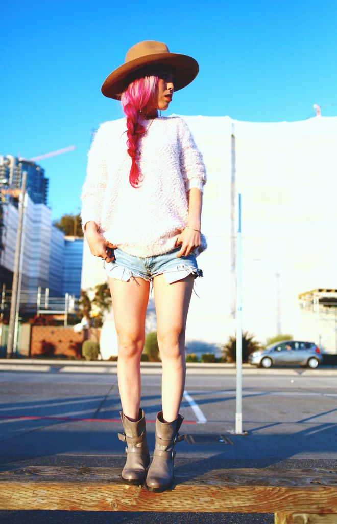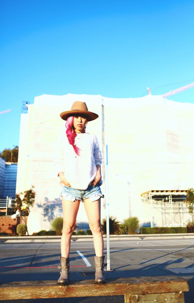 To style my boots, I paired with a blush fuzzy knit and cutoffs for a super laid-back attire. Whenever I go for casual looks, I try to focus on how I can balance the whole look since I am a very short girl! So accessorizing is the key, and wearing a hat definitely helps to direct the eyes upward! I first opted for a beanie but switched to a camel wide brimmed hat because I wanted to add a feminine touch to the look. And side braids gives an extra cuteness along with the hat! I had so much fun shooting these boots at Seattle waterfront, one of my favorite spots for sure!