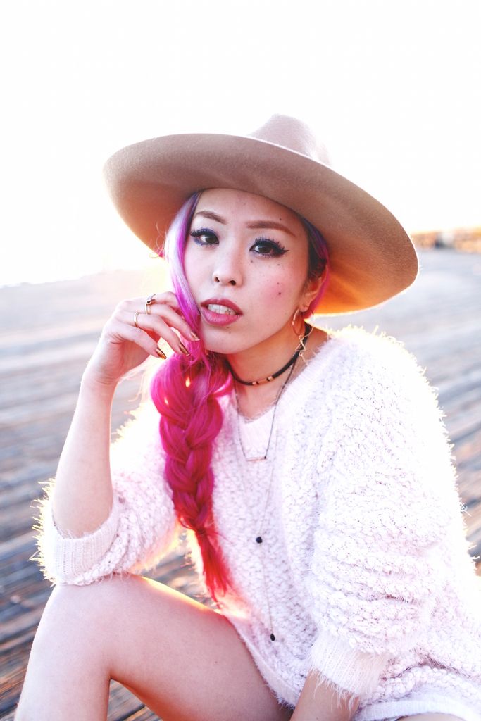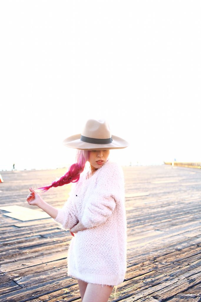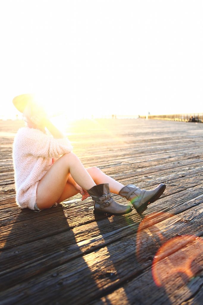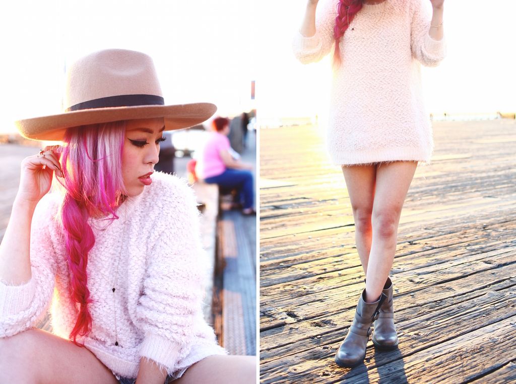 To style my boots, I paired with a blush fuzzy knit and cutoffs for a super laid-back attire. Whenever I go for casual looks, I try to focus on how I can balance the whole look since I am a very short girl! So accessorizing is the key, and wearing a hat definitely helps to direct the eyes upward! I first opted for a beanie but switched to a camel wide brimmed hat because I wanted to add a feminine touch to the look. And side braids gives an extra cuteness along with the hat! I had so much fun shooting these boots at Seattle waterfront, one of my favorite spots for sure!