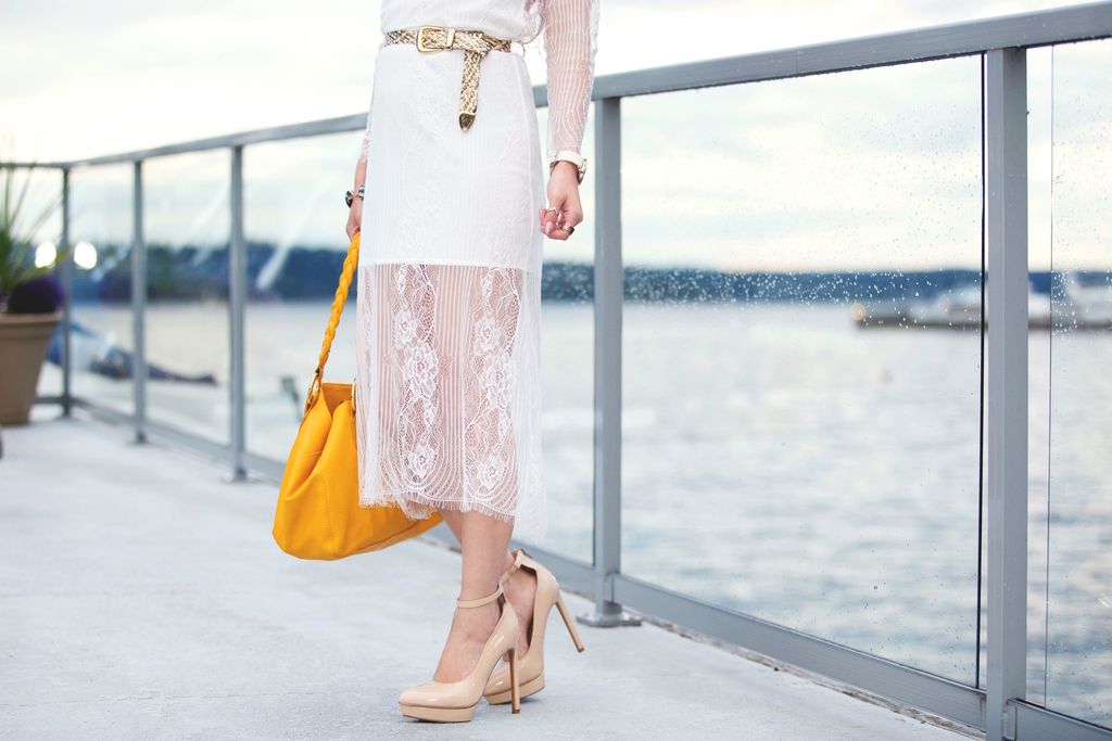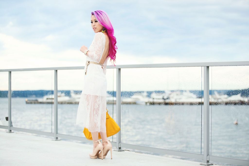 We are all so excited to see the streets covered up with beautiful orange leaves, and we definitely need more cozy knits, pretty coats, and OTK boots! I know, I know...! But it doesn't hurt anyone to dream of warmer weather with this amazing white dress, right? ( loving these dresses, here, here, here) A few posts back, I shared this look where I wore this dress as a perfect midi lace skirt. Do you remember? So this is how the dress looks like, and I can't help but love its wide open-back detail. It's sexy yet lovely, which is perfectly wearable from day to night. Or even for a special occasion! Every girl needs a stunning white dress in her closet, and this number is definitely the one for me at the moment!!