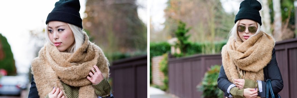 To style this lovely sweater, I matched the color scheme with a pair of camo skinny jeans and a dark green bag. I layered it up with a button down shirt underneath and blazer over it. I love this layering technique because it never fails to be so chic and sophisticated! I finished the look by pairing these ultimate winter essentials - a beanie and oversized scarf - for extra coziness because the warmer, the better!!