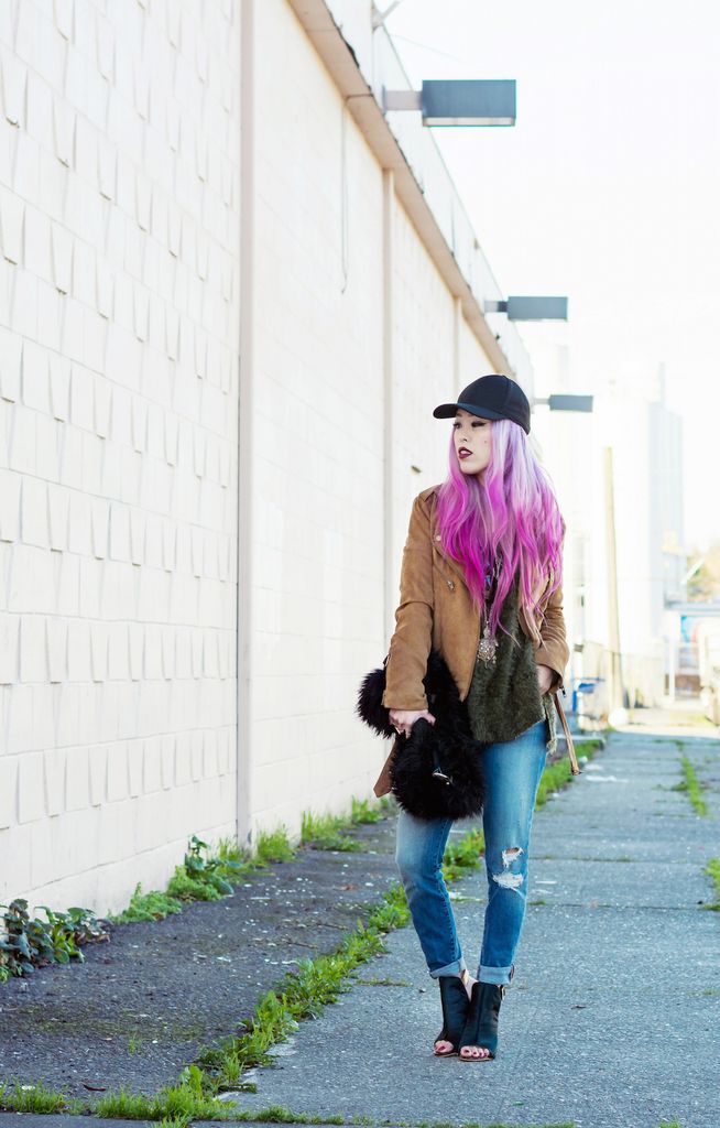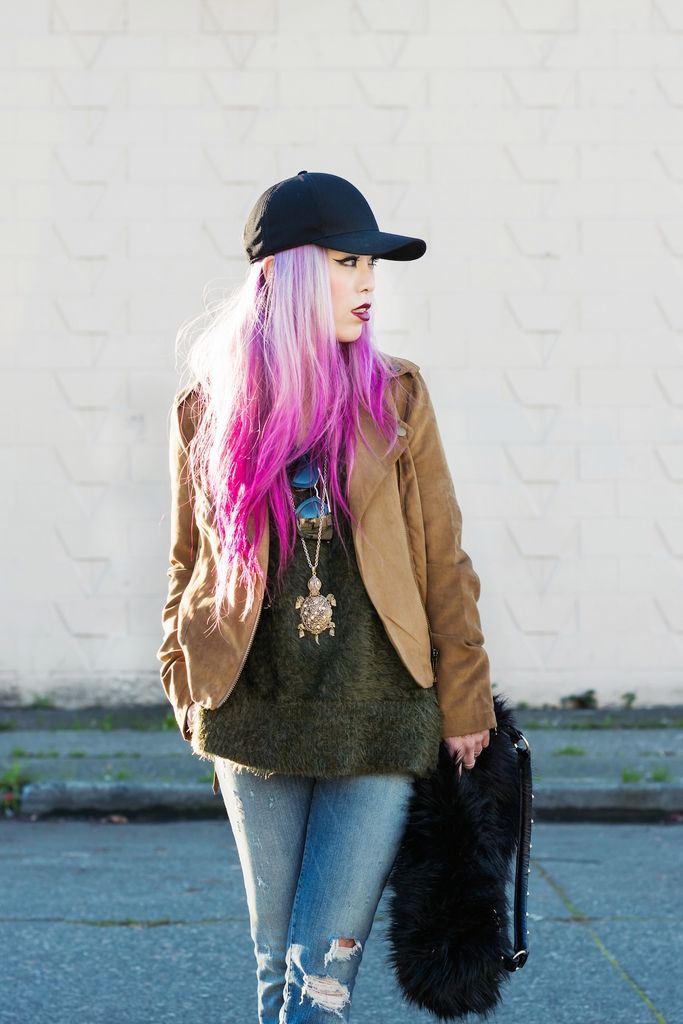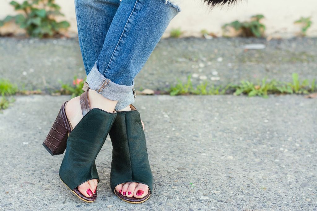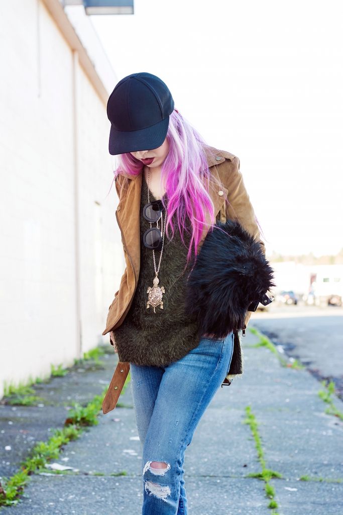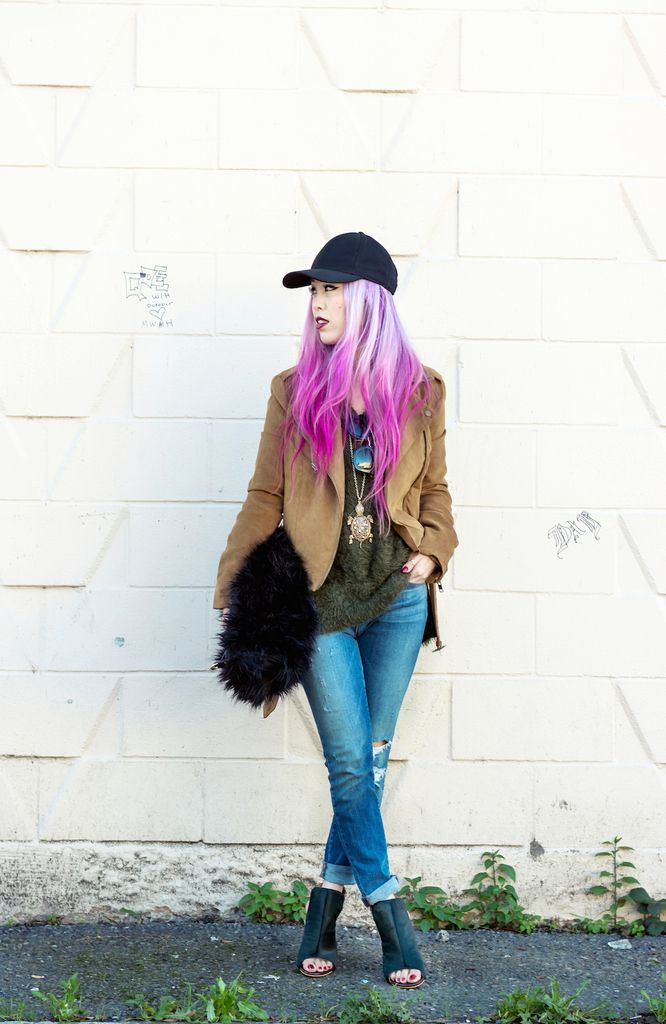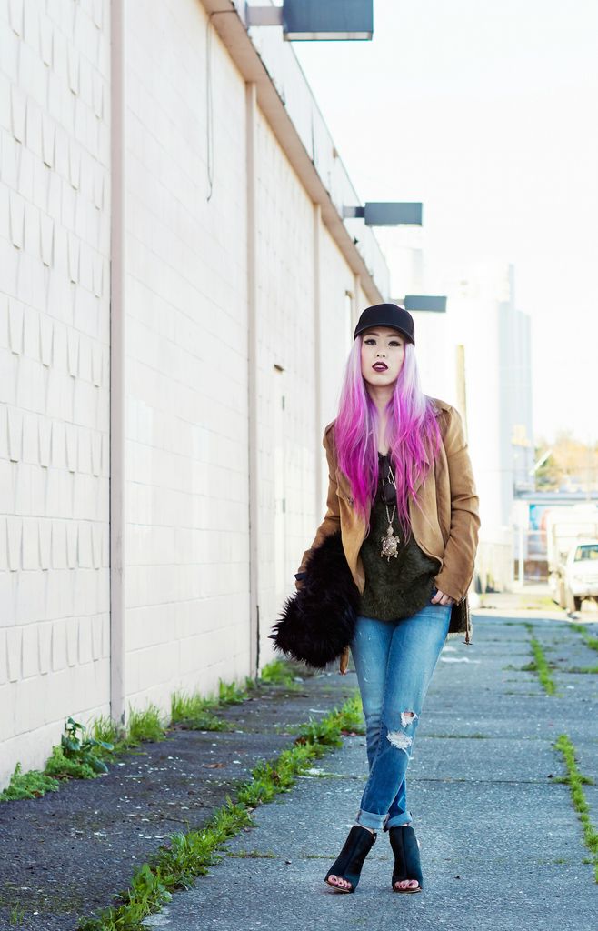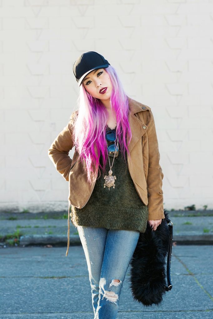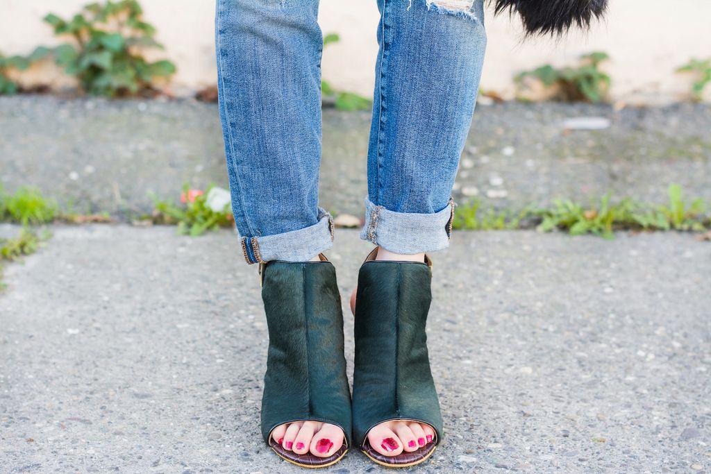 I recently got thise awesome pair of booties that are hand-crafted with an amazing deep green calf hair from ALYSIA. It's already too cold to rock this pair barefoot in Seattle, but I've been wearing them with tights and socks since the week I received it. I can't get over how sophisticated they are, and the comfiness is beyond incredible!!! For today's look, I decided to center these booties to create the rest of the outfit, which I thought it would be fun to achieve the "Earth Color" combo style with a bit of a casual sporty vibe. This look could be perfect for watching sports and holiday shopping! Green and camel is such an easy way to create that style, so I simply combined my favorite khaki sweater and camel faux suede jacket, along with my comfiest J Brand jeans.