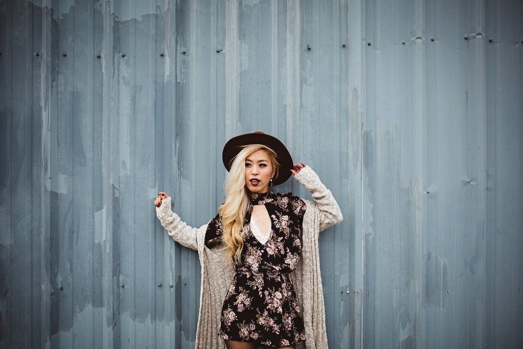 Floral are the ultimate lovely prints all year around, so I picked this oh-so cute long sleeve mini dress from Flynn Skye wearing a pair of lace bra underneath. To layer it up, I opted for this Free People long cardigan and sheer tights with over-the-knee boots. I had to adjust the length to make it flattering, but luckily Fox + The Feather has this awesome antique metal belt by Love Strength. When you are going for a boho style, you can't forget rocking a hat! They have this amazing Brixton coffee colored fedora, and it totally complements the look! I wasn't a big fan of backpacks, but adding a Cleobella white lather studded backpack is a perfect playful element while Native Riot silver dainty necklace gives a perfect edition as a final touch!