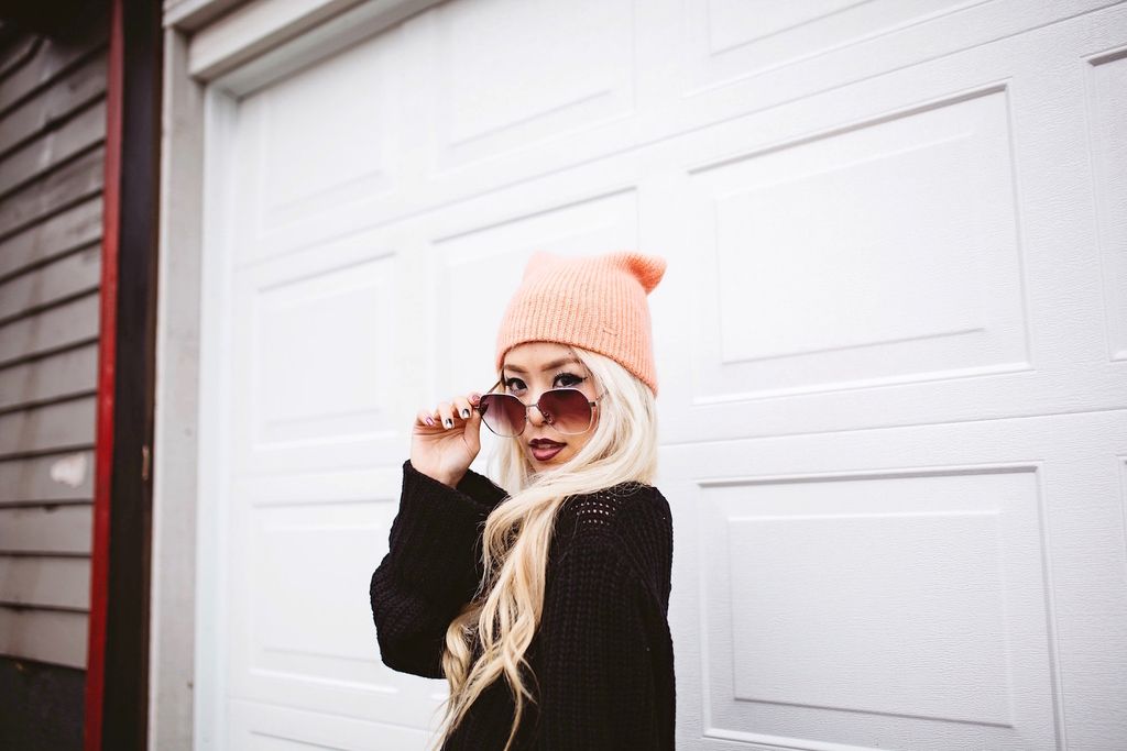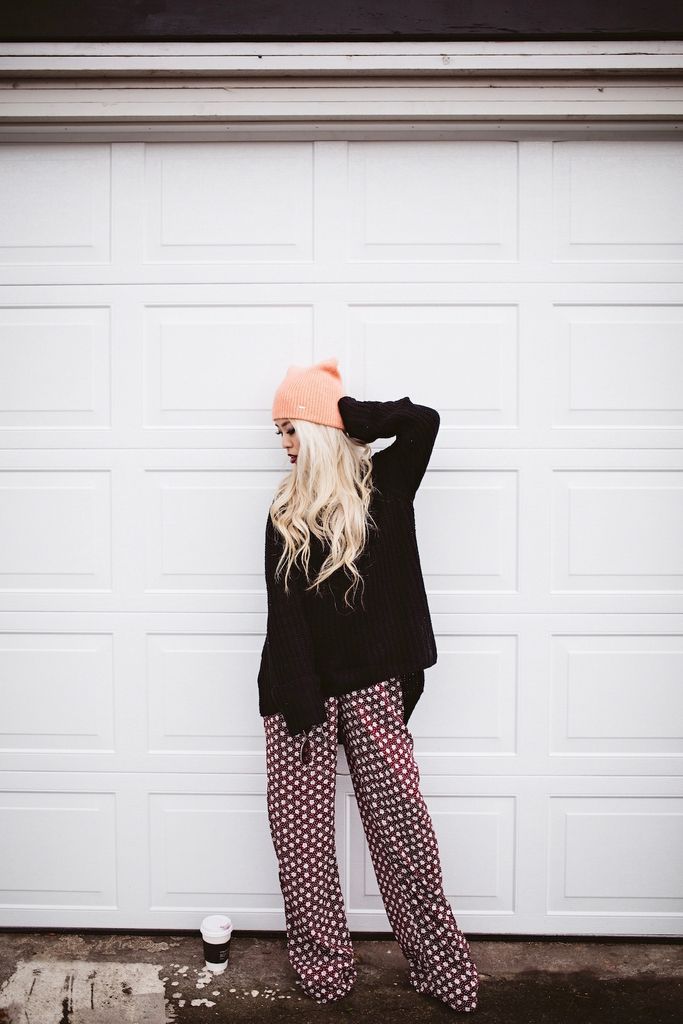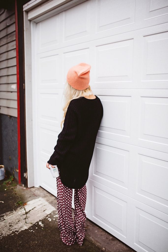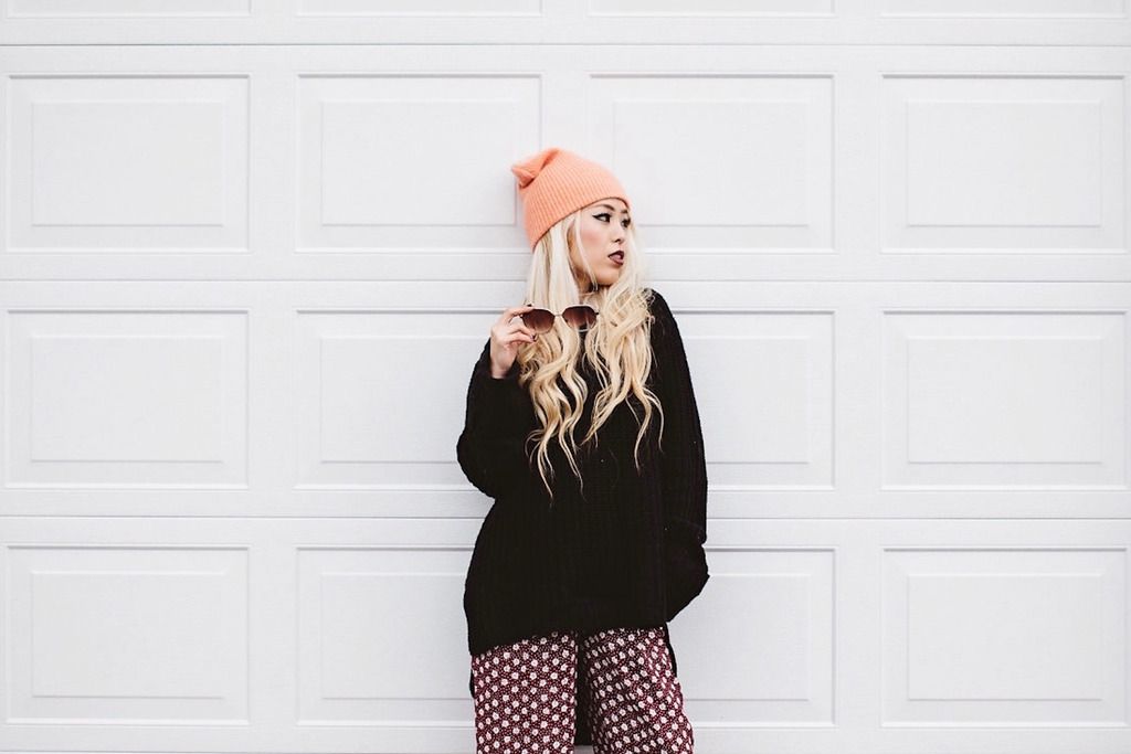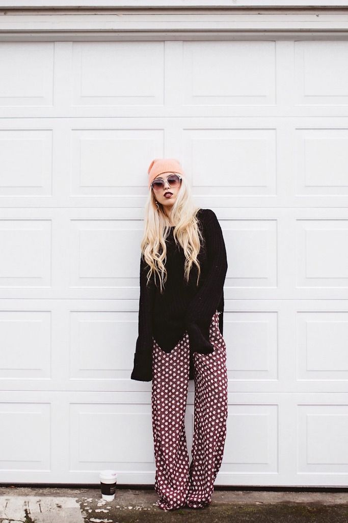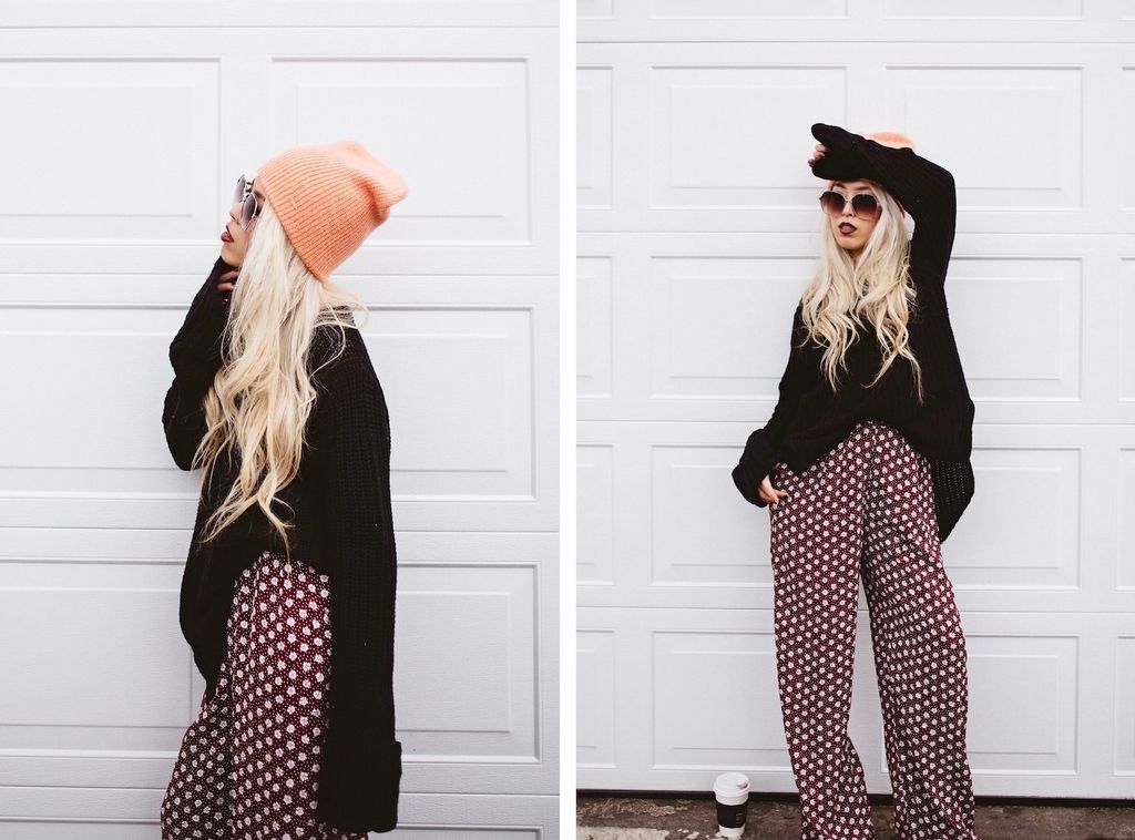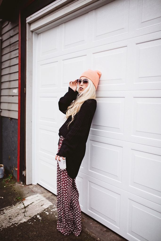 The sweater is amazingly snuggly, and I am in love with the shorter helm & large rolled cuffs - like "Look Ma! No hands!" These wide leg pants are also very soft, yet are a bit of oversized for me. I managed to nail them by wearing platforms hidden under the pants! They are high-waisted, so it gives the effect of elongating the legs which I don't look super short! That's what I love about wearing them! I was inspired by those awesome floral wide pants to complete my look with a hint of 70's vibe by paring an oversized sunglasses, and then keep it warm with a soft coral beanie as a playful touch because the warmer, the better!!!