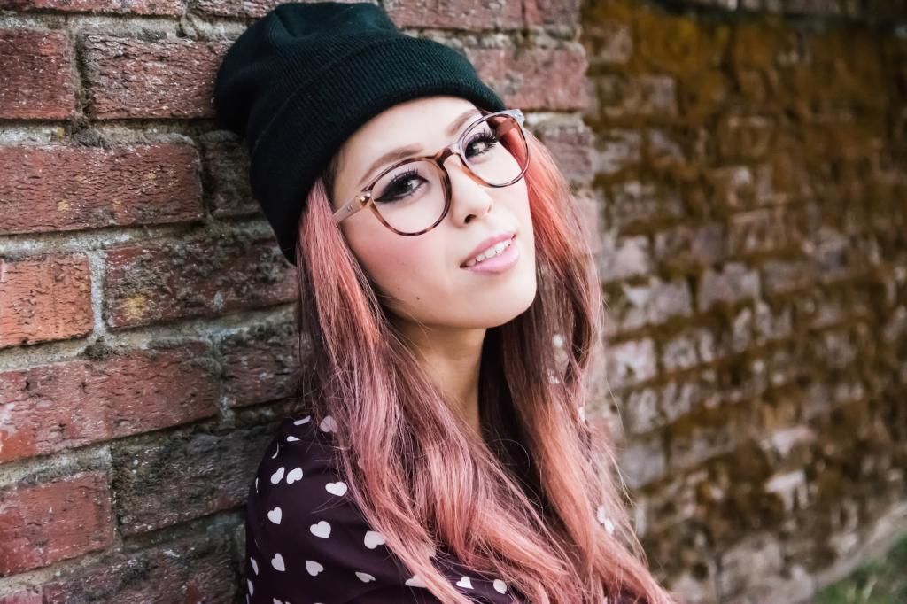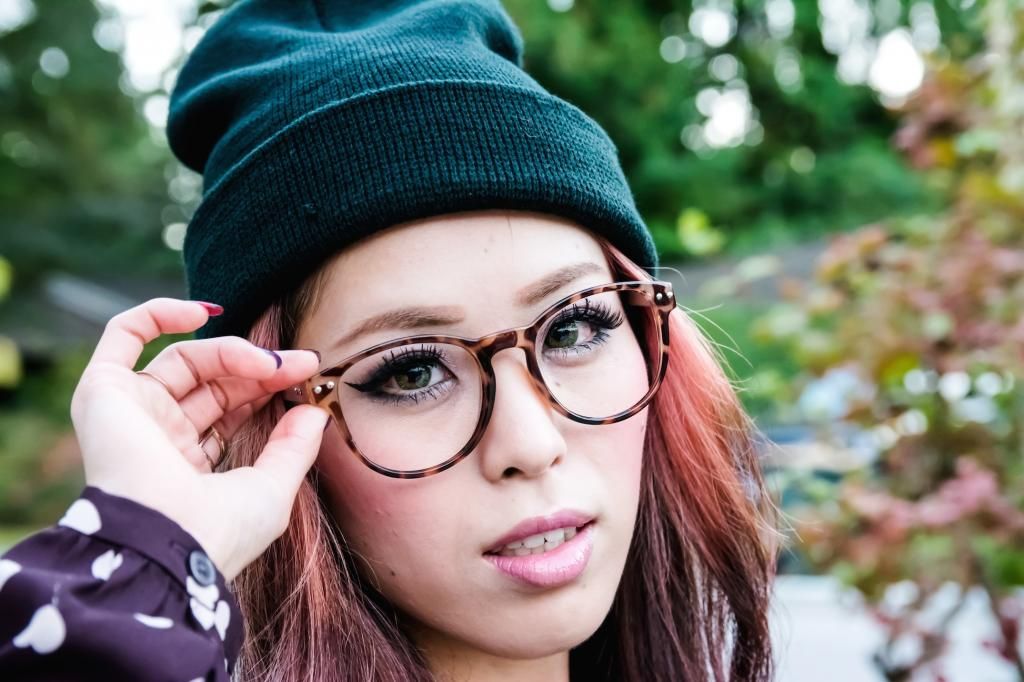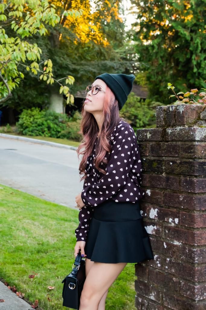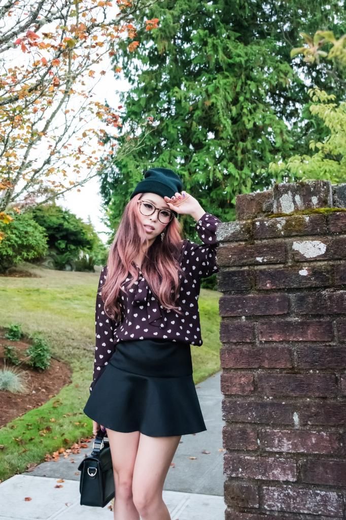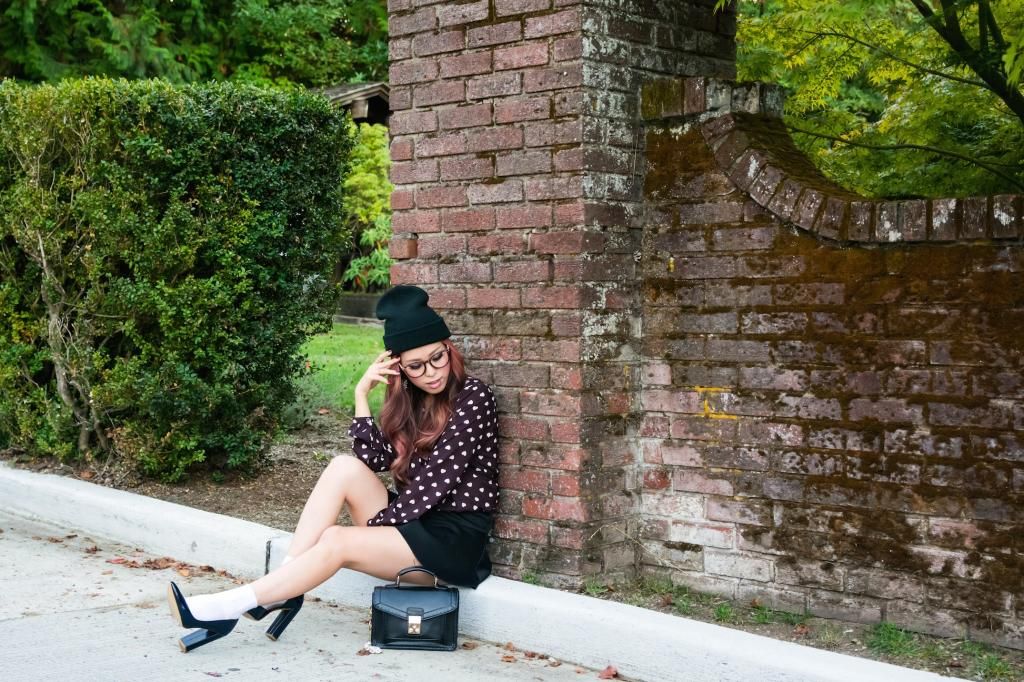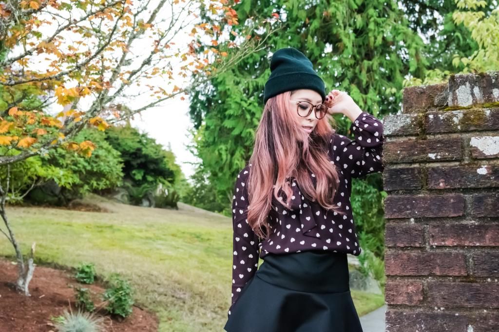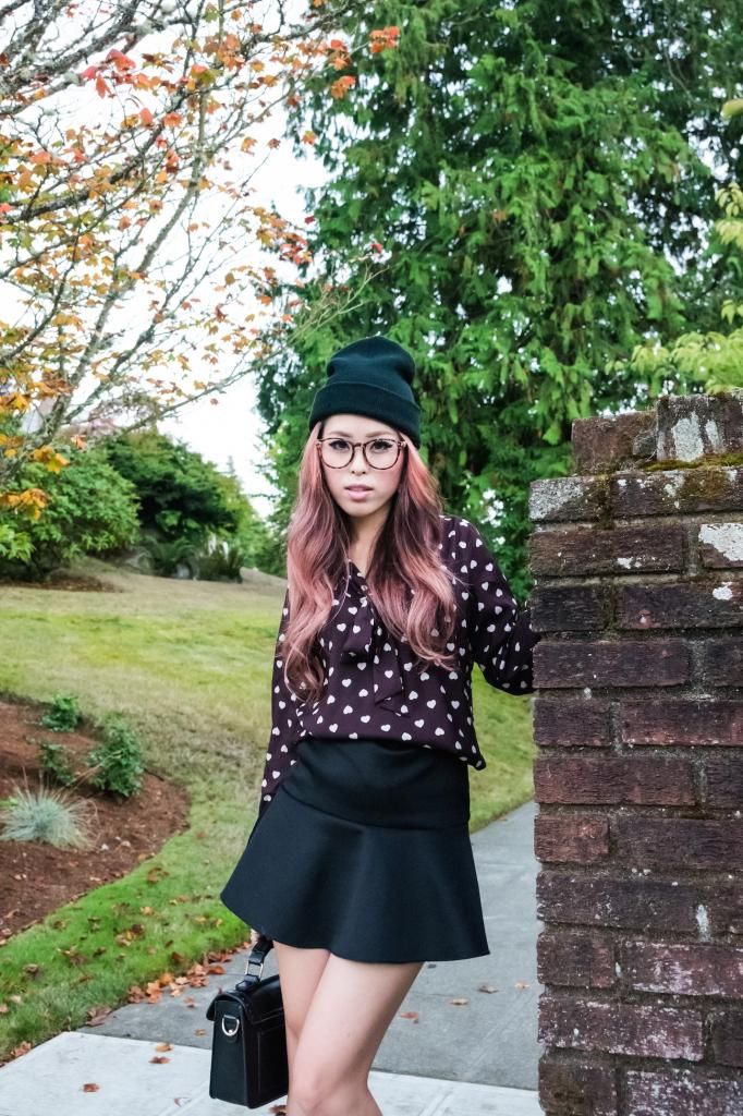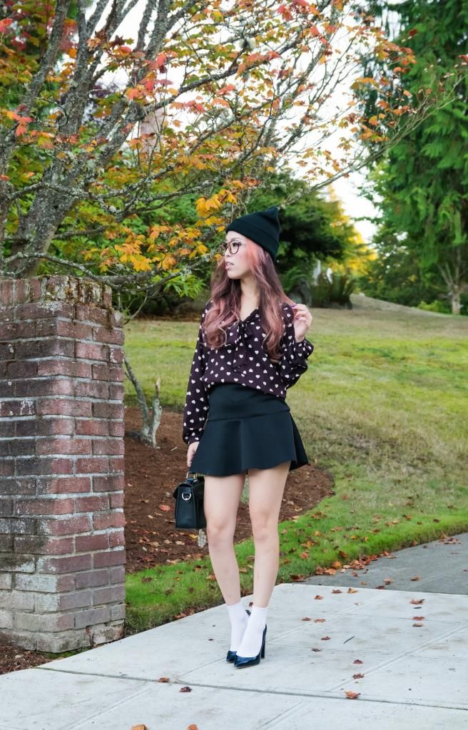 For today's look, I went with a slightly dressed up ensemble by pairing it with my favorite skirt and a combination of ankle socks and pointy pumps. Still, I wanted to keep it as an any-day look, so I added two pieces to tone things down: a beanie and a pair of fake glasses. Although curled hair with a beanie and fake glasses are really easy to achieve, the results are very pretty! I have so many beanies and glasses in my closet. I guess I will do this combo over and over by switching them around!