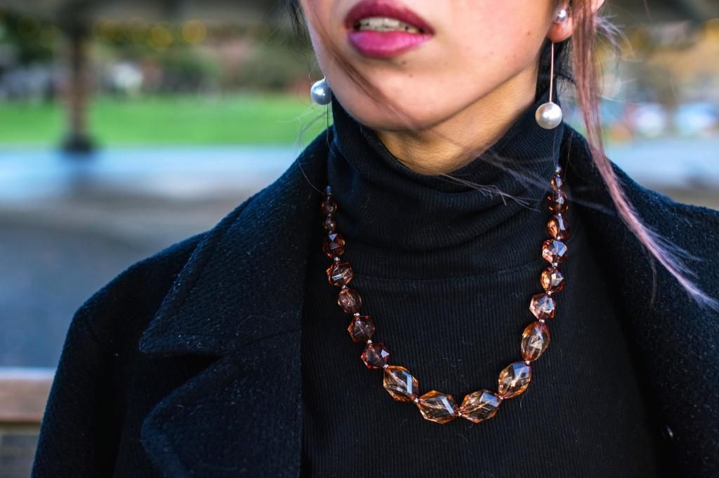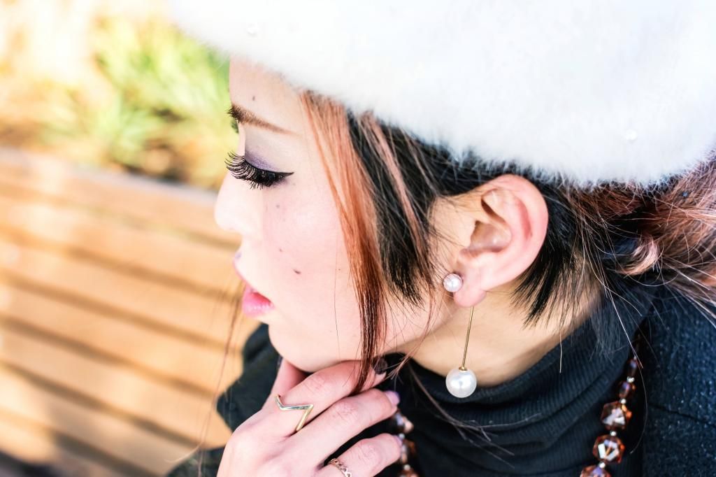 I styled them up with a black turtle neck sweater, which is my current No.1 favorite versatile top, and kept the color theme going with a back jacket and bag to make the skirt and shoes pop. My seasonal look can't be completed without a hat, so I added this cozy white beret for a brighter touch. Nothing better than with a little bling, right? I adore these gold bar backdrop pearl earrings thanks to ShopRoxx!