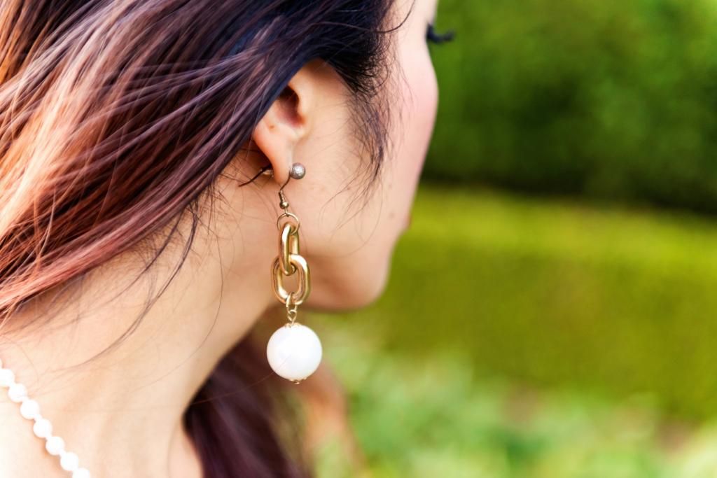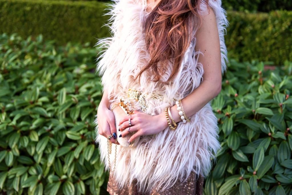 On the dress with fur vest look, I personally prefer this one more. It feels warmer, has a soft touch and makes me feel super festive! If you have a fur vest, it's no-brainer to create a similar dressy look. Throw on your fur vest over any of your favorite dress, pick a thin belt and tie it around your waist. Really effortless right? When it comes to accessories for holiday looks or any party look, gold jewelry just fits right to me. If they have pearl details, that's even better. That's why you see a lot of gold and pearl elements on this look!