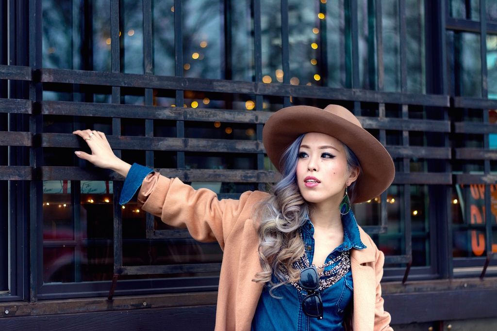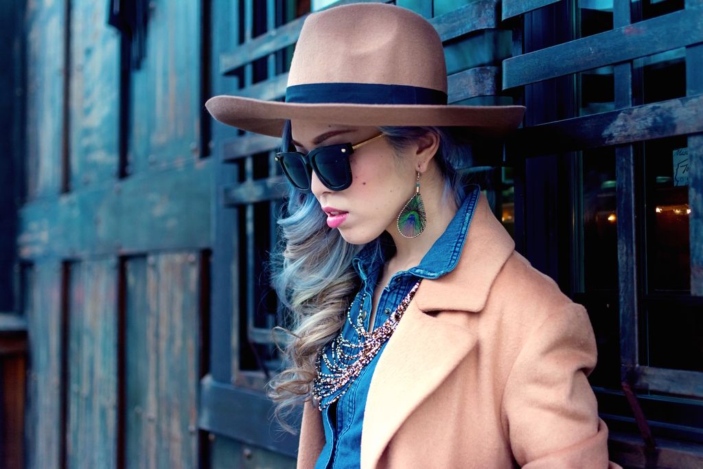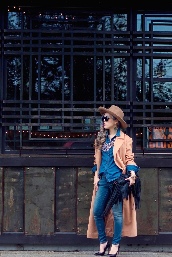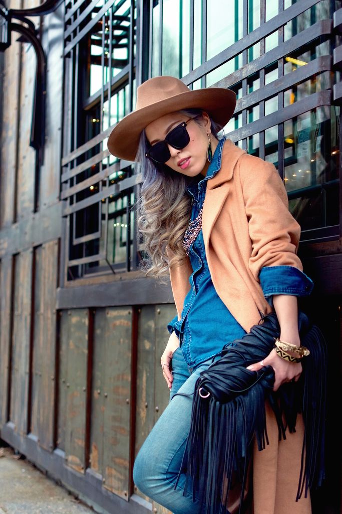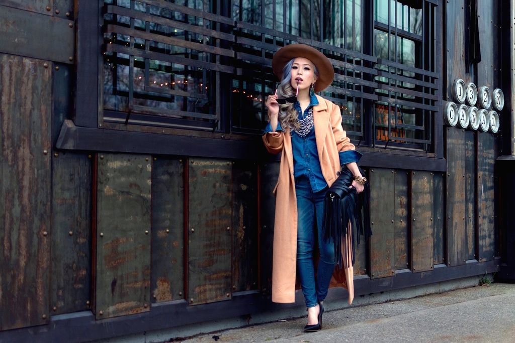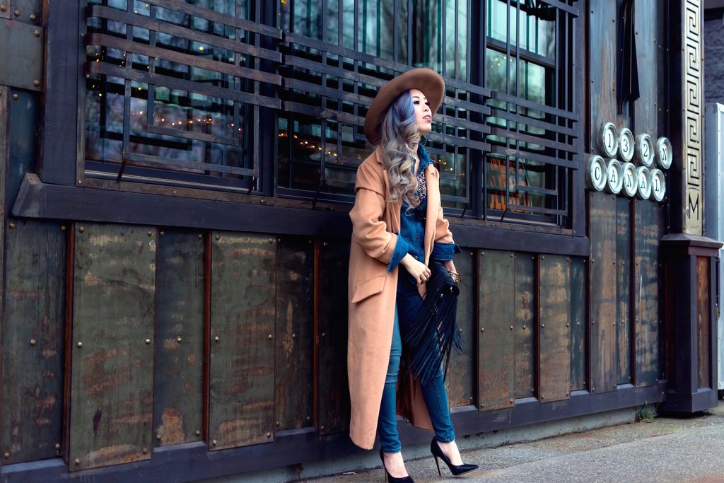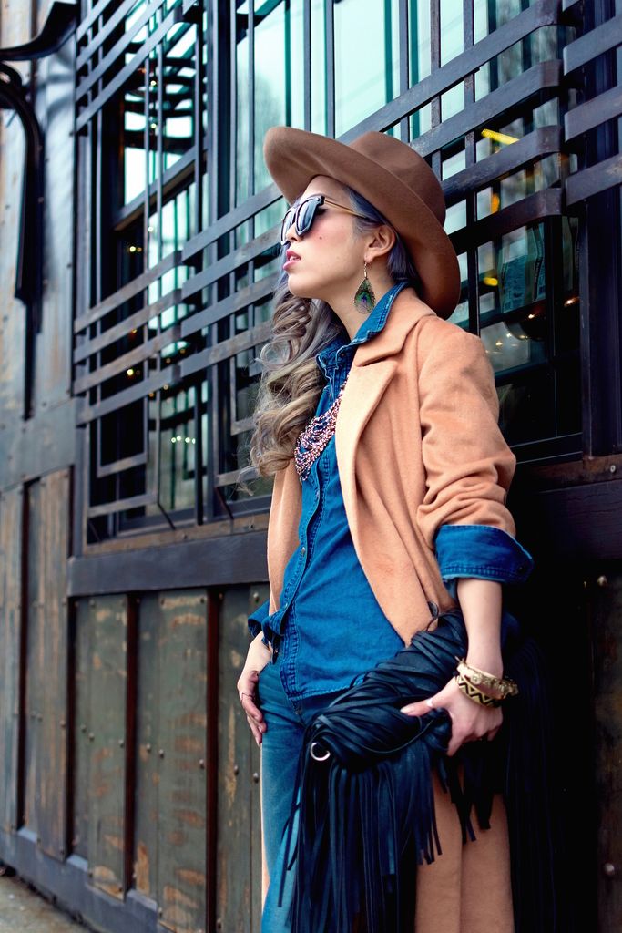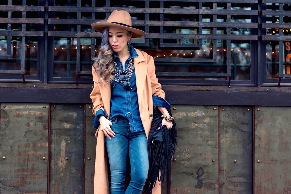 The weather in Seattle lately has been super unpredictable, and to be honest with you, it's driving me insane. It's sunny one day, and next day it completely changes to a gloomy, chilly, unhappy weather. The worst part is.... it greatly affects my emotions! Ugh! I can't wait for summer! But outfit wise, I am really pleased with the cool temperature only because I can take advantage of it to still wear my favorite coats! This camel oversized coat has been a big hit ever since I've owned in my closet, and needless to say, I've worn it a countess time already. And I wanted to create something spring-inspired. Whenever I wear an outerwear, especially a little thick one, I always tend to tuck up the sleeves to show some skin. This one easy trick instantly transforms any winter-ish coat to an appropriate spring one. Even a black bicker jacket as well. Today's look was created around this awesome coat with a double denim ensemble along with a camel hat which is my major hat obsession right now.