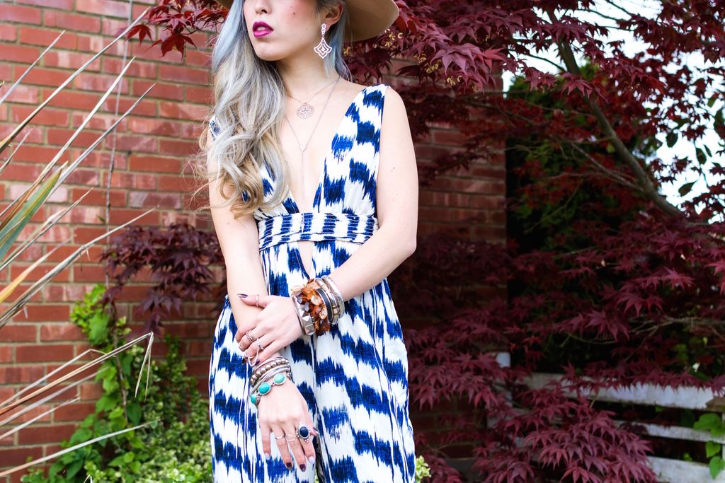 I have no idea where to start, but I am feeling freaking amazing to fully recover from the incident and settle in to a new place!! My room wasn't furnished so I went to furniture shopping at IKEA last Friday and got my hands on a lot of stuff. A bunch of lights (because my room is in the basement), candles, clocks, storage goodies, and.... BED! When I first moved in here, I was bedless. I had no choice to sleep on the floor without a mattress - just a few blankets in place of it. It was kinda of nightmare, and I actually had super weird dreams a few nights in a row! So I am totally excited to sleep in my cute, white fluffy bed now!! Ever since my childhood, I've always dreamed of having a canopy because why not? It's adorable and makes a bed much cuter! And guess what? That dream came true!!! My landlord is so nice that I can decorate however I want to. My new roommate just painted his wall from white to orange. I can't wait to DIY my new house! Hopefully I will have a chance to peek my new room/house for you guys soon!When I found this awesome jumpsuit at Forever 21 online, I once neglected to buy it because I didn't know how good it would look on me. Then, a few days later, when I went to their store with my friend, I found it and she pushed me to try it on. Immediately, I fell in love with it!!! Although I had to tailor the hems, this jumpsuit is perfect to me! I have a long torso and short legs, which always make me hard to find a flattering jumpsuit. So actually this is my first time owning it! I definitely love the 70's inspired print with a blue color accent. I am generally not very comfortable wearing a piece that widely opens around my chest due to small breasts. But this jumpsuit solves the problem and gives me an even better look.
