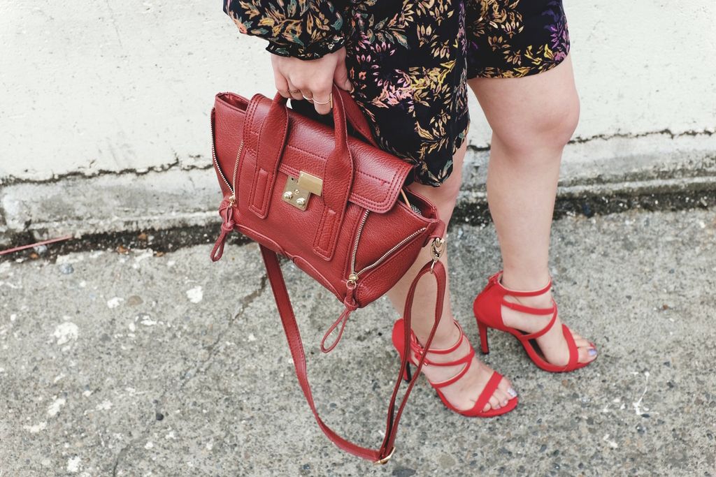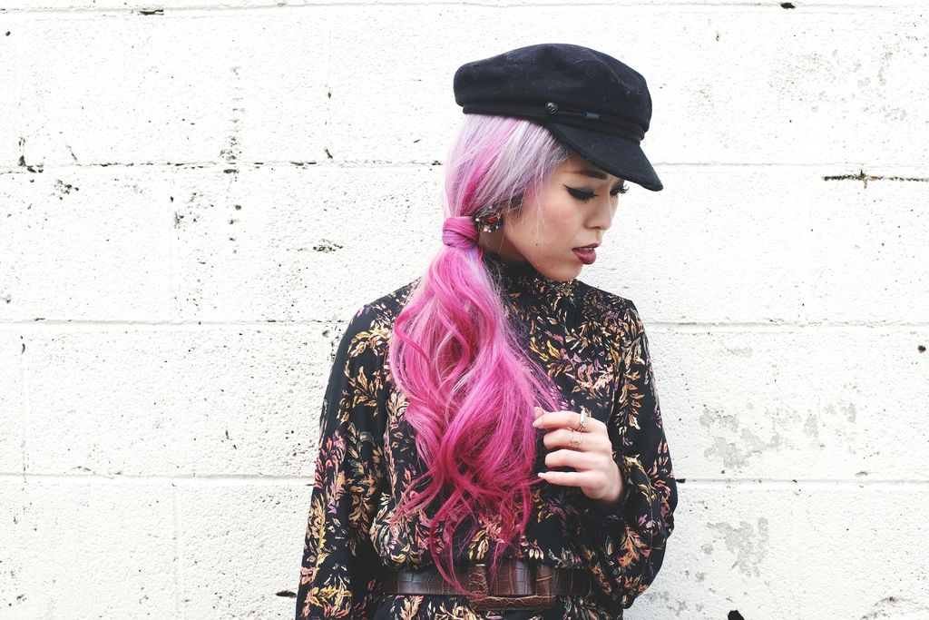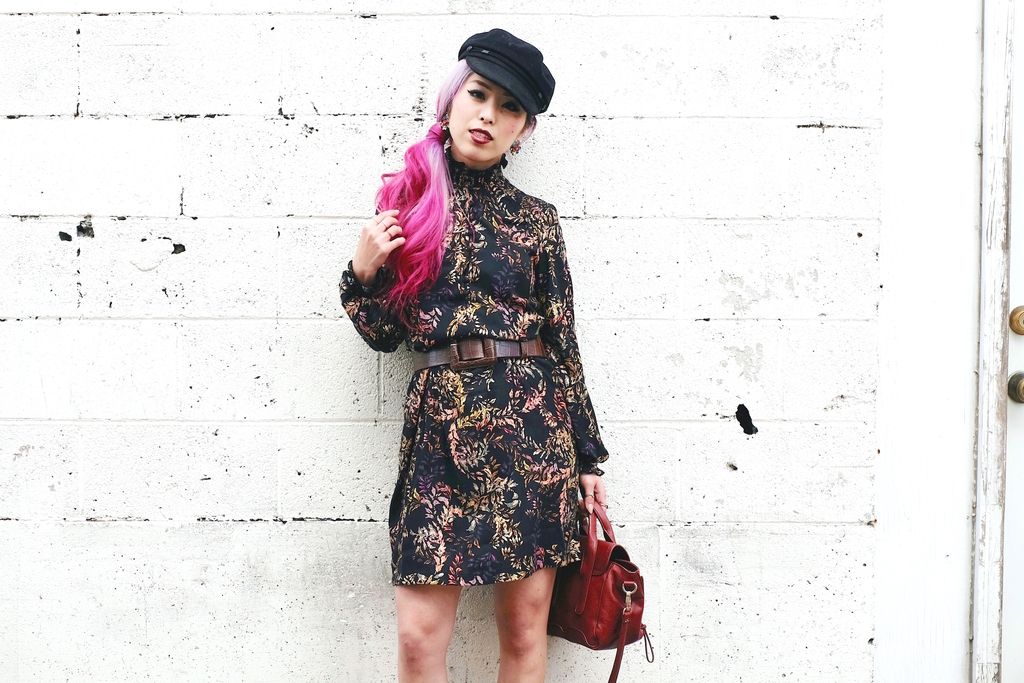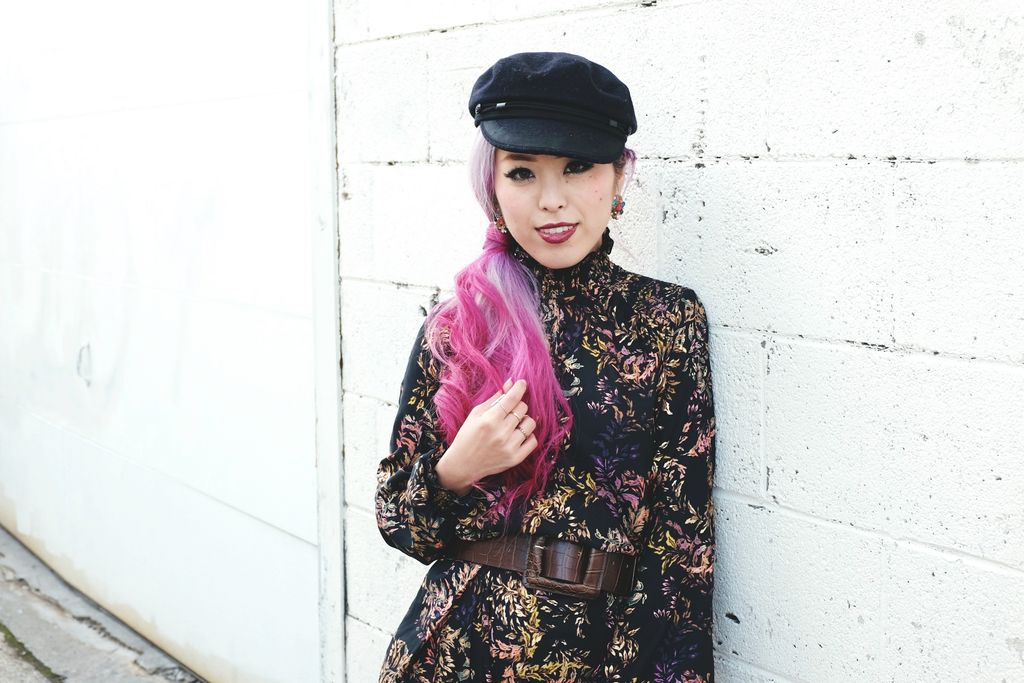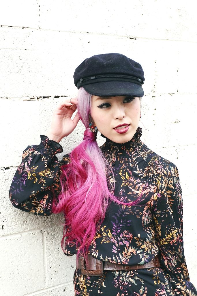 As the season shifts, I always love getting inspired by looking through all the seasonal trends, and one of the most appealing trends I wanted to try and sport is "Nouveau Victorian." Then, I came across this gorgeous dress from H&M as I was hunting for a fall dress. Not only is the price super duper wall-friendly, I just also can't get over everything about this dress -- high-collar, ruffled, floral prints, and button details on the neck. Especially these ruffles are what make the dress so adorable. The length, of course, was not very flattering on me because of my height, so I had to adjust it with the wide belt. I styled it with a pair of red sandals since it was pretty warm when I shot this look, and I am glad I did! It shows that you can still wear sandals during fall while the look is totally fall appropriate. I finished off by wearing my favorite fall hat and berry lips to emphasize the Victorian vibe. Light-curled side ponytail definitely gives some feminine flare along with the jeweled earrings!