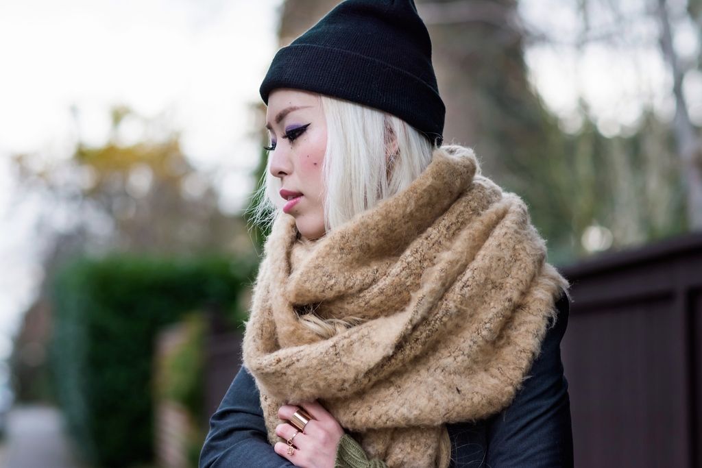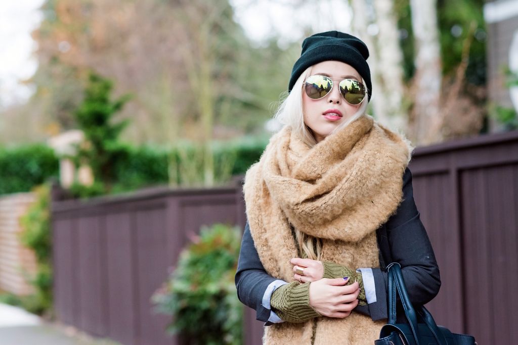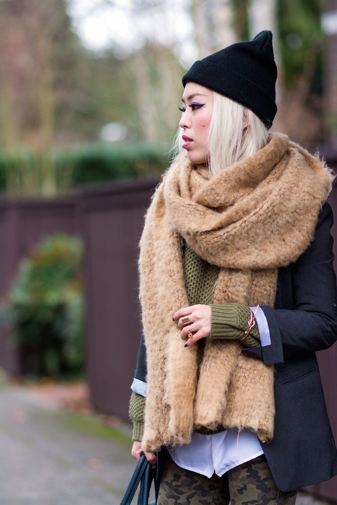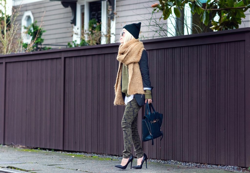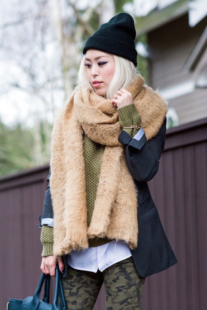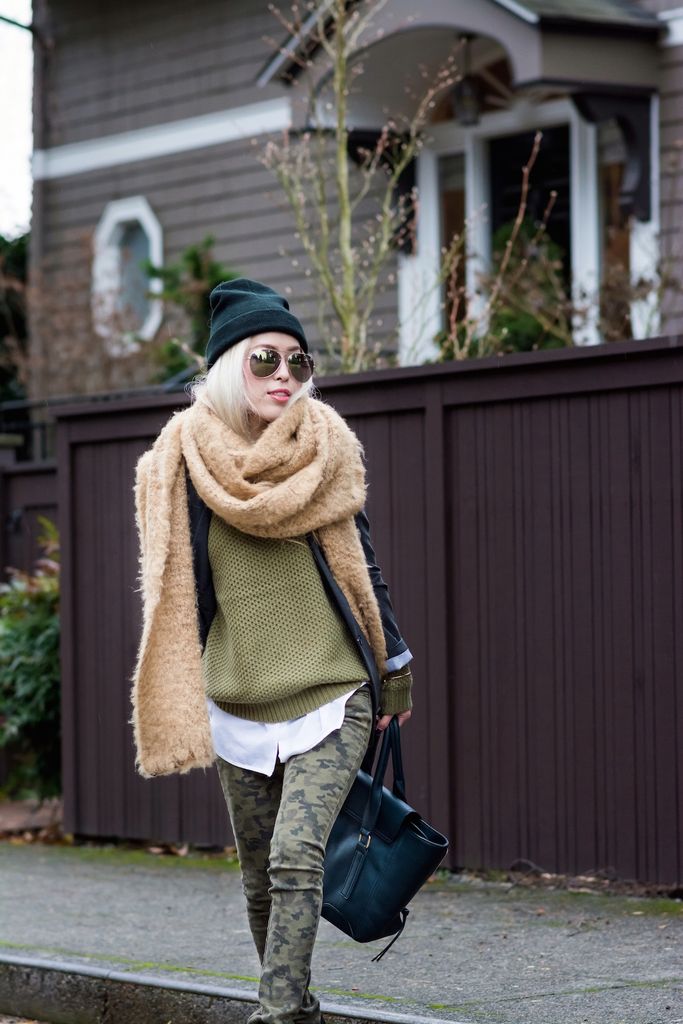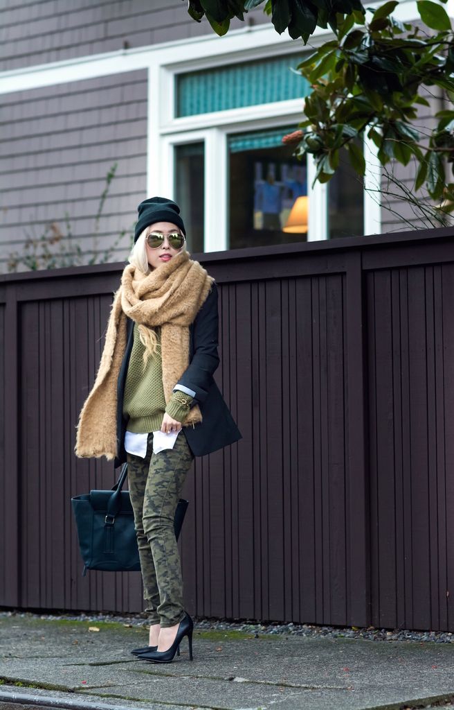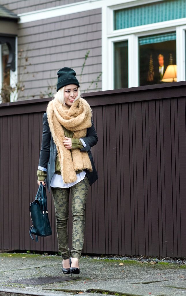 To style this lovely sweater, I matched the color scheme with a pair of camo skinny jeans and a dark green bag. I layered it up with a button down shirt underneath and blazer over it. I love this layering technique because it never fails to be so chic and sophisticated! I finished the look by pairing these ultimate winter essentials - a beanie and oversized scarf - for extra coziness because the warmer, the better!!